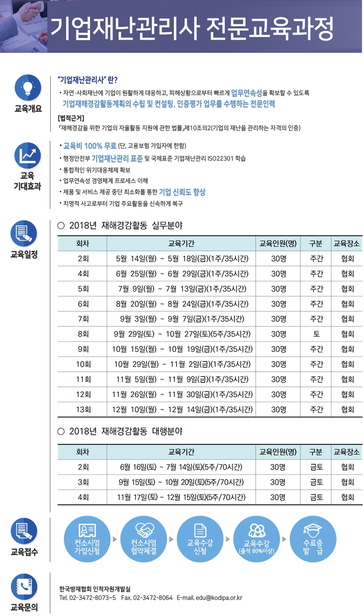2018년 기업재난관리사 전문교육 교육생 모집(실무, 대행, 인증평가) 2018-05-11 1526028740.png (450969K) 목록보기 이전글2018년 국가안전대진단 추진결과 발표2018.05.16 다음글최근 봄비로 저수율 상승, 일부지역은 지속적인 물 관리 필요2018.05.09