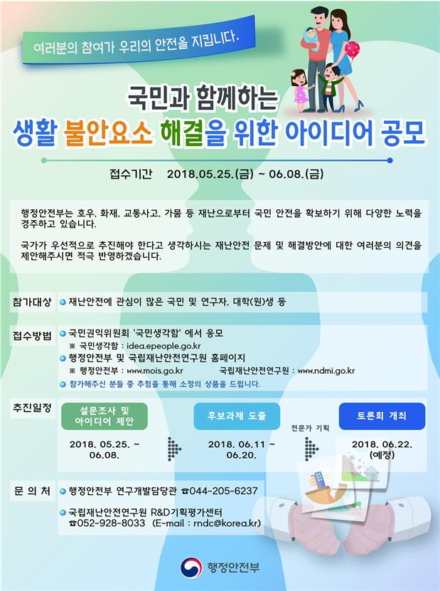 국민과 함께하는 생활 불안요소 해결을 위한 아이디어 공모 2018-06-04 (서식)국민과함께하는 생활불안요소 해결을 위한 대국민 아이디어 공모(하이퍼링크포함).hwp (38912K) 목록보기 이전글정부, 6월 가뭄 예・경보 발표2018.06.11 다음글폭염 시 외출이나 야외활동 자제해야2018.06.04