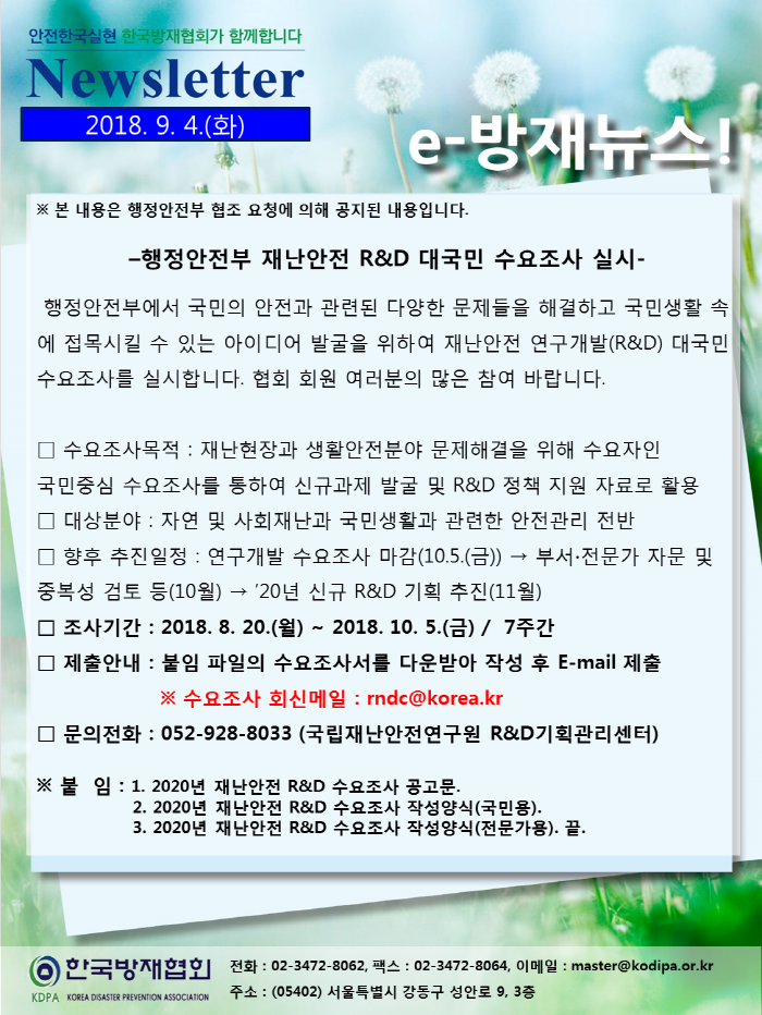 [안내] 행정안전부 재난안전 R&D 대국민 수요조사 실시 2018-09-04 ※ 수요조사 작성양식은 공고문의 후반부에 첨부되어 있습니다. 2020년 재난안전 R&D 수요조사 공고문.hwp (155136K) 목록보기 이전글소방시설 앞 불법 주‧정차, 비상구 폐쇄 등 공익신고 강화 한다2018.09.06 다음글집중호우 대비 피해 우려지역 안전관리 강화2018.09.04