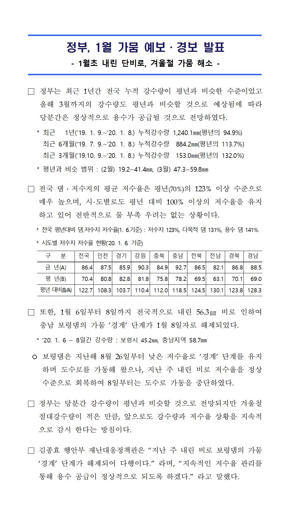 정부. 1월 가뭄 예보 경보 발표 2020-01-13 [붙임] 정부. 1월 가뭄 예보·경보 발표(기후재난대응과).pdf (246748K) [첨부] 가뭄시 국민행동요령.pdf (67777K) 목록보기 이전글행정안전부 '안전문화 우수사례집' 발간, 안전문화 확산 기대2020.01.14 다음글신년 맞이 산행, 안전사고에 주의하세요!2020.01.03