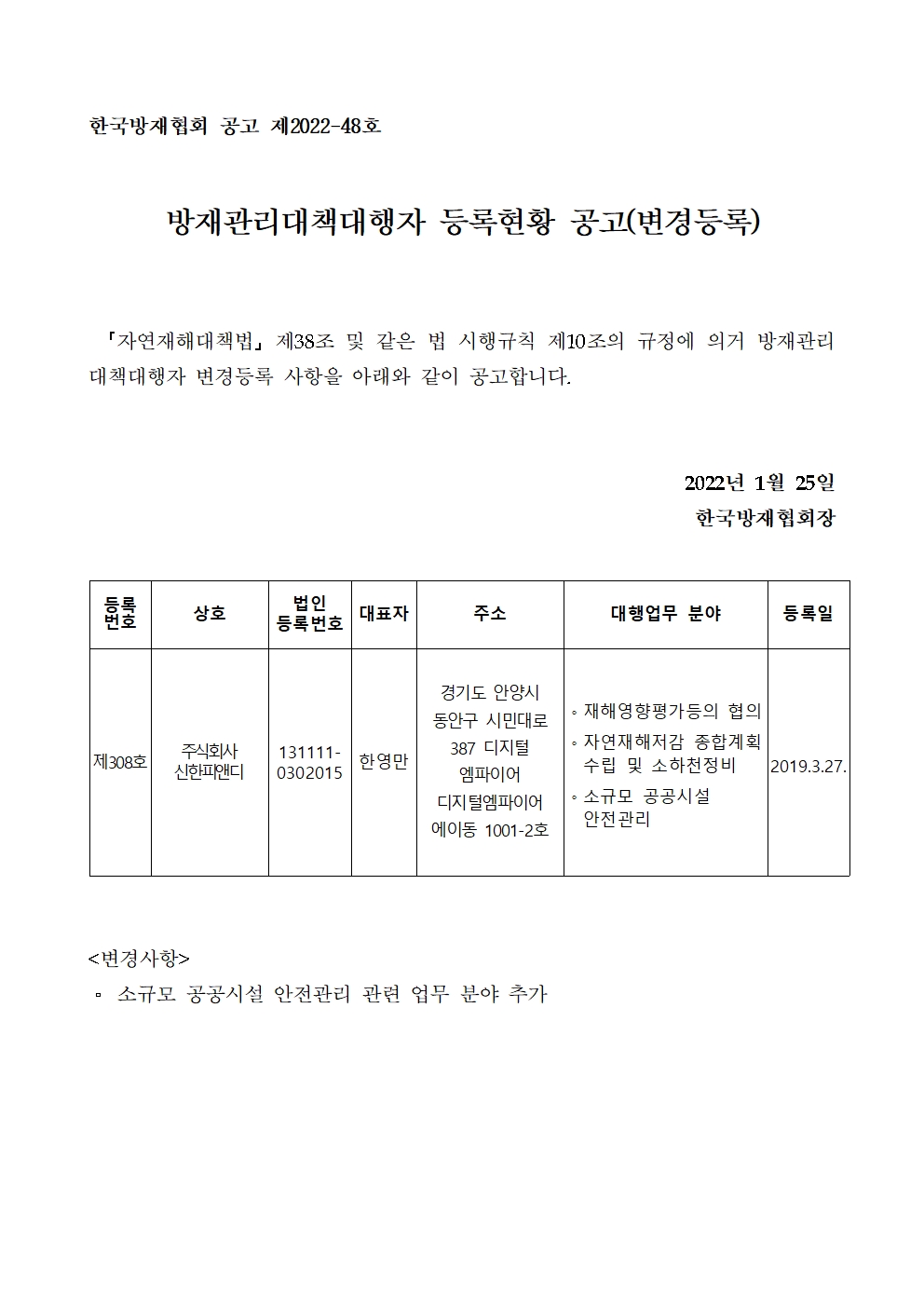 방재관리대책대행자 등록현황 공고(변경등록) - (주)신한피앤디 2022-01-25 공고문_제2022-48호_방재대행자 등록현황 공고(변경)_주식회사 신한피앤디.pdf (63524K) 목록보기 이전글방재관리대책대행자 등록현황 공고(변경등록) - 아람이엔씨(주)2022.01.25 다음글방재관리대책대행자 등록현황 공고(변경등록) - (주)동진이엔시2022.01.25