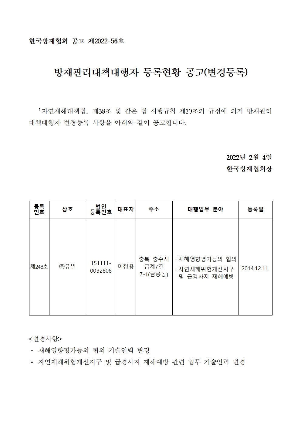 방재관리대책대행자 등록현황 공고(변경등록) - (주)유일 2022-02-04 공고문_제2022-56호_방재대행자 등록현황 공고(변경)_(주)유일.pdf (60795K) 목록보기 이전글방재관리대책대행자 등록현황 공고(변경등록) - (주)대원엔지니어링2022.02.04 다음글방재관리대책대행자 등록현황 공고(변경등록) - (주)건영엔지니어링2022.02.04