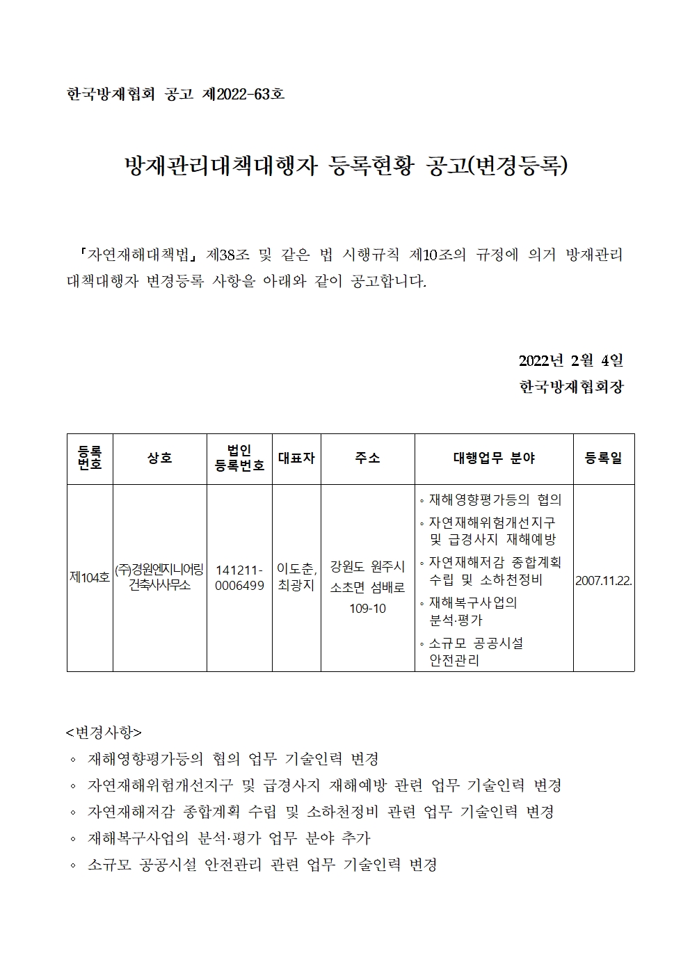 방재관리대책대행자 등록현황 공고(변경등록) - (주)경원엔지니어링건축사사무소 2022-02-04 공고문_제2022-63호_방재대행자 등록현황 공고(변경)_(주)경원엔지니어링건축사사무소.pdf (72145K) 목록보기 이전글방재관리대책대행자 등록현황 공고(변경등록) - (주)혜인이엔씨2022.02.04 다음글방재관리대책대행자 등록현황 공고(변경등록) - (주)드림이엔지2022.02.04