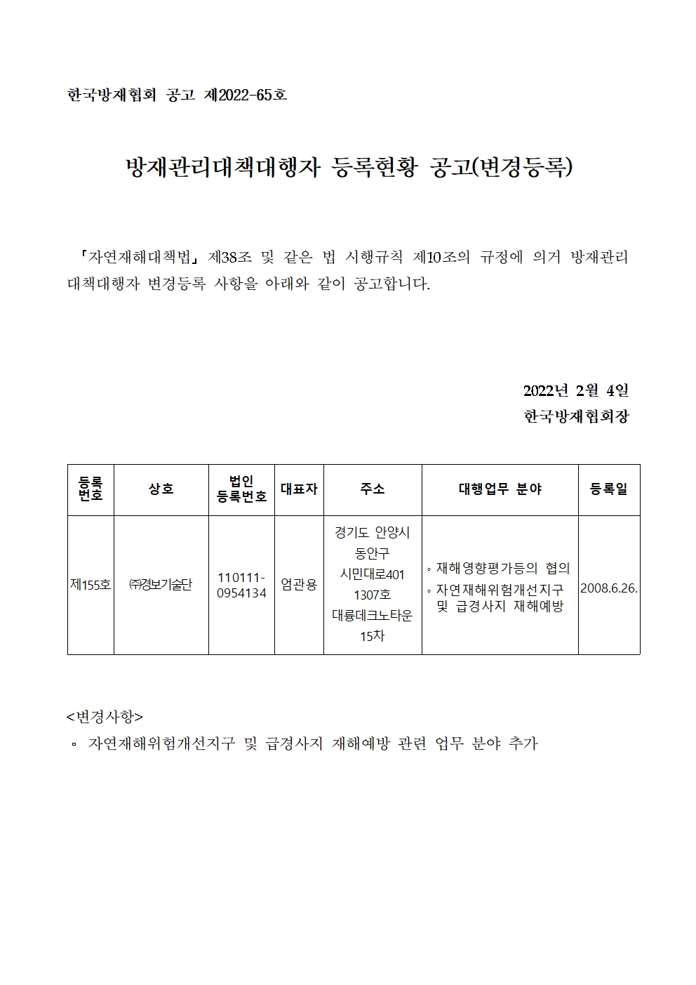 방재관리대책대행자 등록현황 공고(변경등록) - (주)경보기술단 2022-02-04 공고문_제2022-65호_방재대행자 등록현황 공고(변경)_(주)경보기술단.pdf (61292K) 목록보기 이전글방재관리대책대행자 등록현황 공고(변경등록) - (주)케이지엔지니어링종합건축사사무소2022.02.04 다음글방재관리대책대행자 등록현황 공고(변경등록) - (주)혜인이엔씨2022.02.04