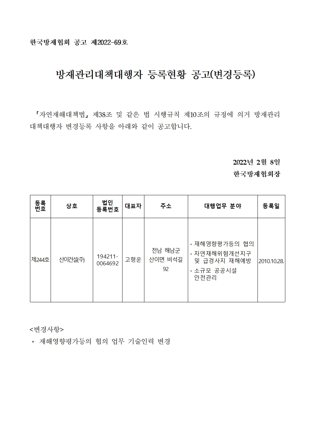 방재관리대책대행자 등록현황 공고(변경등록) - 산이건설(주) 2022-02-09 공고문_제2022-69호_방재대행자 등록현황 공고(변경)_산이건설(주).pdf (60130K) 목록보기 이전글방재관리대책대행자 등록현황 공고(신규등록) - (주)하나이엔씨2022.02.09 다음글방재관리대책대행자 등록현황 공고(변경등록) - (주)로텍엔지니어링2022.02.08
