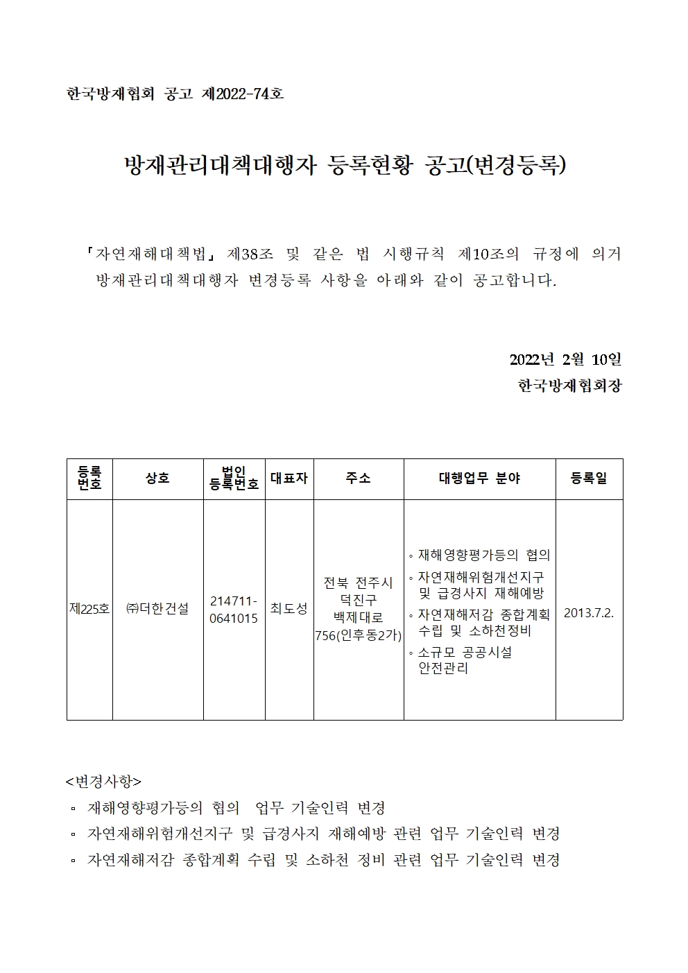 방재관리대책대행자 등록현황 공고(변경등록) - (주)더한건설 2022-02-10 공고문_제2022-74호_방재대행자 등록현황 공고(변경)_(주)더한건설.pdf (67877K) 목록보기 이전글방재관리대책대행자 등록현황 공고(업무휴업) - (주)더한건설2022.02.10 다음글방재관리대책대행자 등록현황 공고(변경등록) - 주식회사 해인엔지니어링건축사사무소2022.02.09