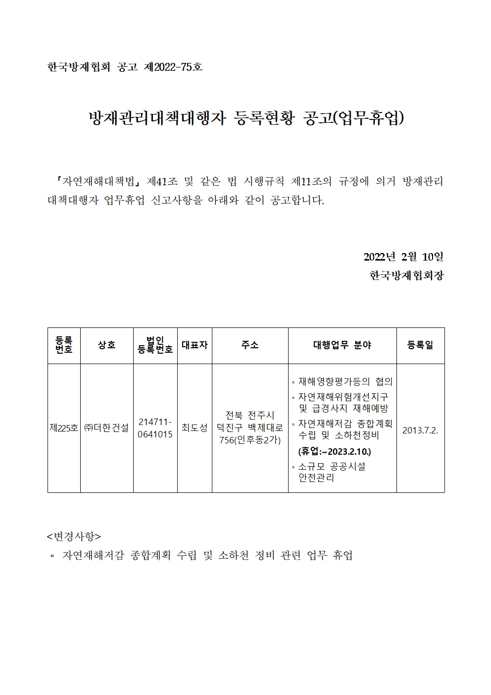 방재관리대책대행자 등록현황 공고(업무휴업) - (주)더한건설 2022-02-10 공고문_제2022_75호_방재대행자 등록현황 공고(휴업)_(주)더한건설.pdf (65449K) 목록보기 이전글방재관리대책대행자 등록현황 공고(변경등록) - (주)기림2022.02.10 다음글방재관리대책대행자 등록현황 공고(변경등록) - (주)더한건설2022.02.10