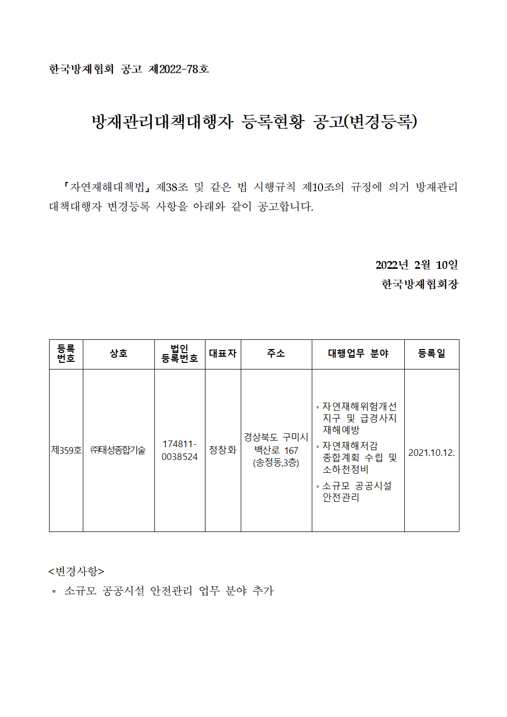 방재관리대책대행자 등록현황 공고(변경등록) - (주)태성종합기술 2022-02-10 공고문_제2022-78호_방재대행자 등록현황 공고(변경)_(주)태성종합기술.pdf (62894K) 목록보기 이전글방재관리대책대행자 등록현황 공고(변경등록) - (주)하이콘엔지니어링2022.02.10 다음글방재관리대책대행자 등록현황 공고(변경등록) - (주)우빈기술공사2022.02.10