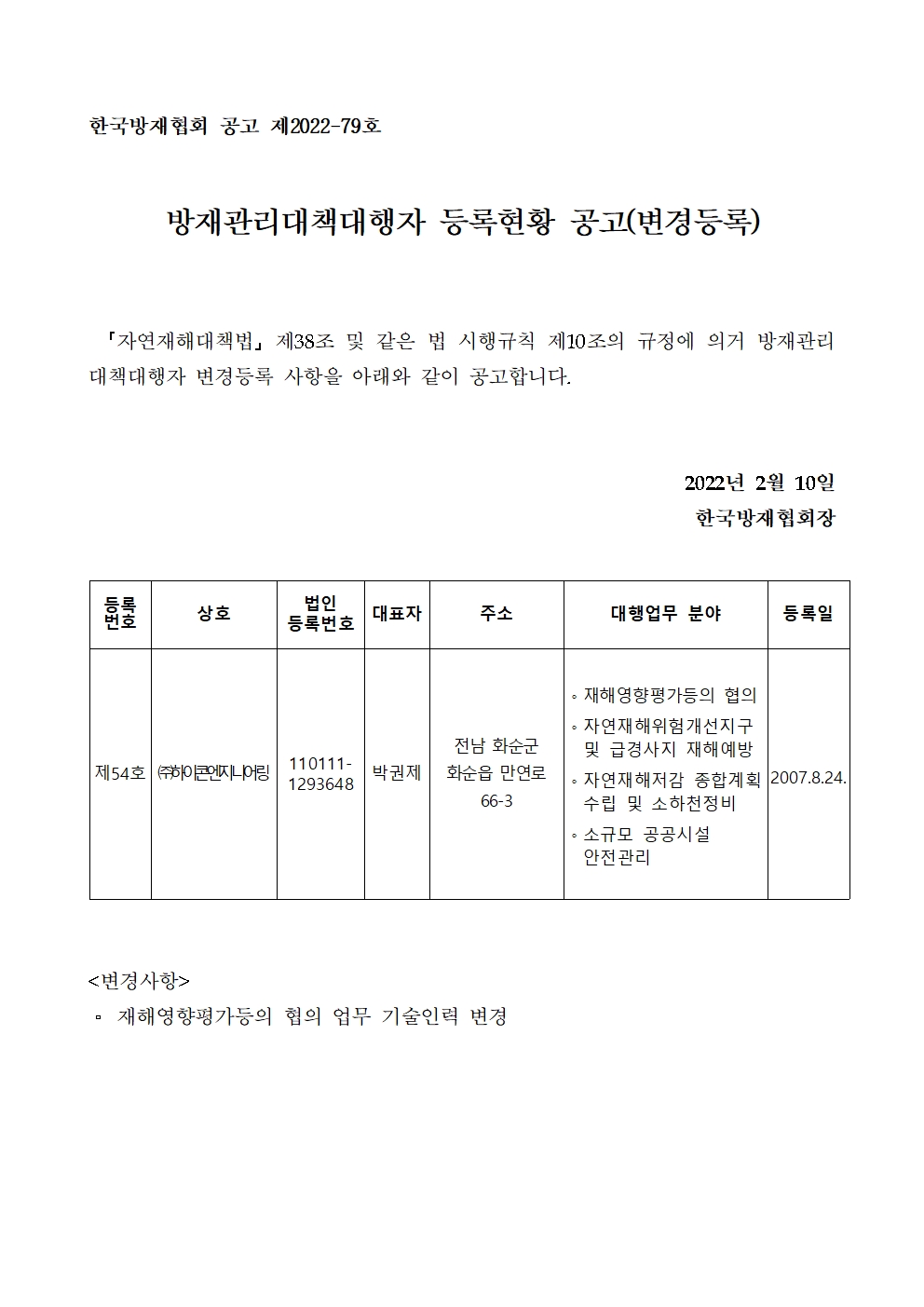 방재관리대책대행자 등록현황 공고(변경등록) - (주)하이콘엔지니어링 2022-02-10 공고문_제2022-79호_방재대행자 등록현황 공고(변경)_(주)하이콘엔지니어링.pdf (63858K) 목록보기 이전글방재관리대책대행자 등록현황 공고(변경등록) - (주)삼경2022.02.10 다음글방재관리대책대행자 등록현황 공고(변경등록) - (주)태성종합기술2022.02.10