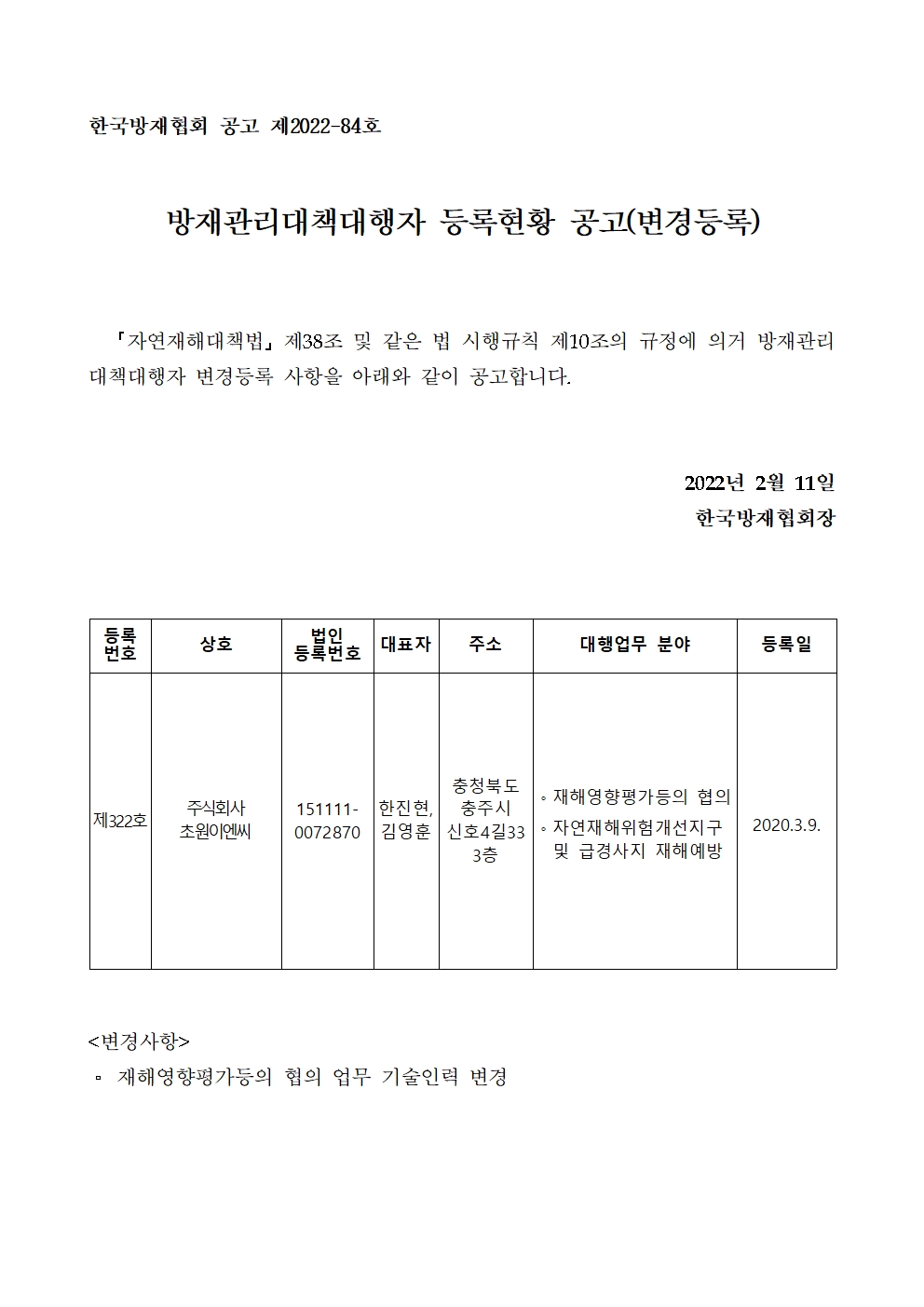 방재관리대책대행자 등록현황 공고(변경등록) - 주식회사 초원이엔씨 2022-02-11 공고문_제2022-84호_방재대행자 등록현황 공고(변경)_주식회사 초원이앤씨.pdf (60601K) 목록보기 이전글방재관리대책대행자 등록현황 공고(변경등록) - 주식회사 초원이엔씨2022.02.11 다음글방재관리대책대행자 등록현황 공고(변경등록) - (주)반석이앤씨2022.02.10