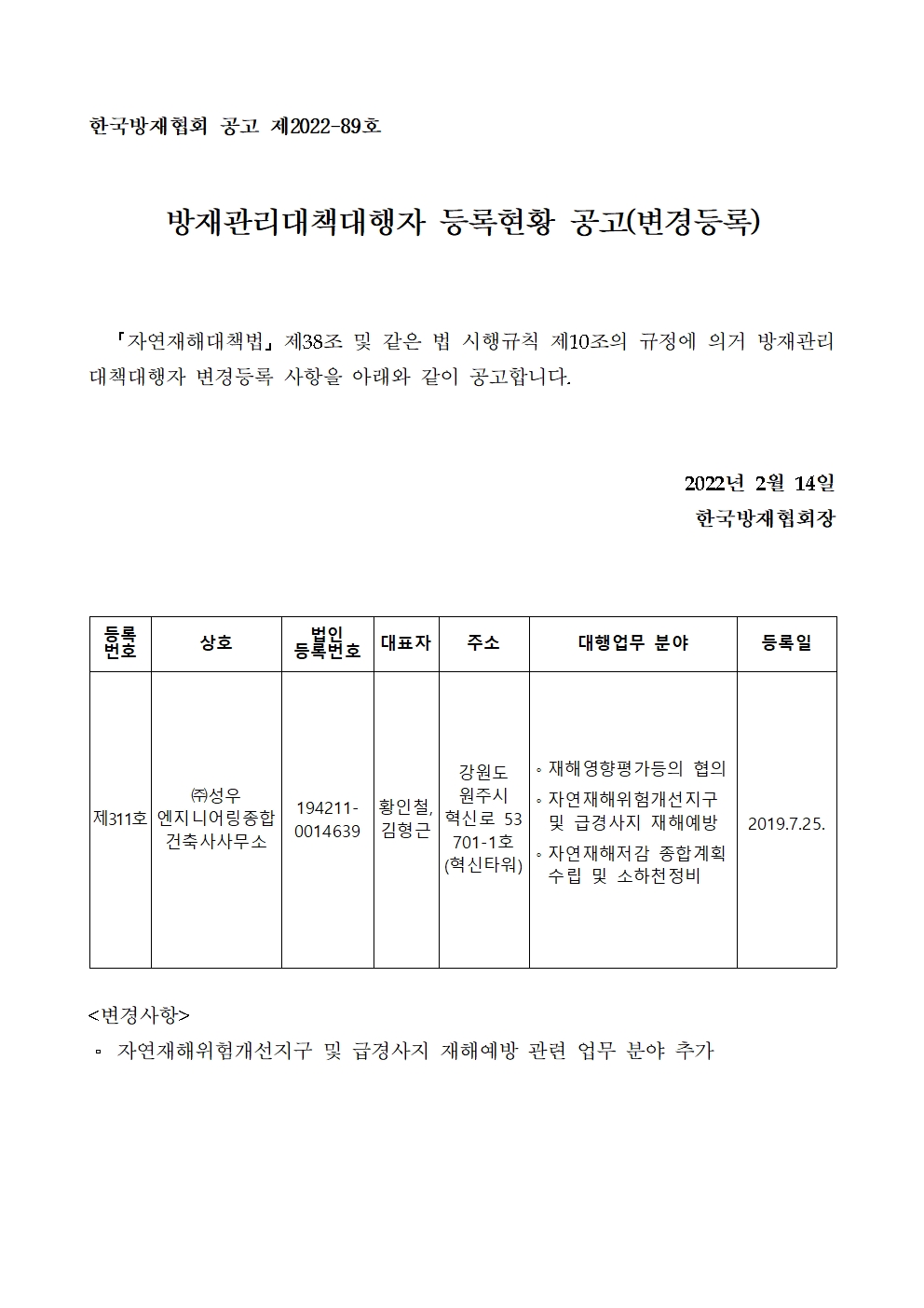 방재관리대책대행자 등록현황 공고(변경등록) - (주)성우엔지니어링종합건축사사무소 2022-02-14 공고문_제2022-89호_방재대행자 등록현황 공고(변경)_(주)성우엔지니어링종합건축사사무소.pdf (65573K) 목록보기 이전글방재관리대책대행자 등록현황 공고(변경등록) - (주)한국종합엔지니어링2022.02.14 다음글방재관리대책대행자 등록현황 공고(변경등록) - (주)정엔지니어링2022.02.14