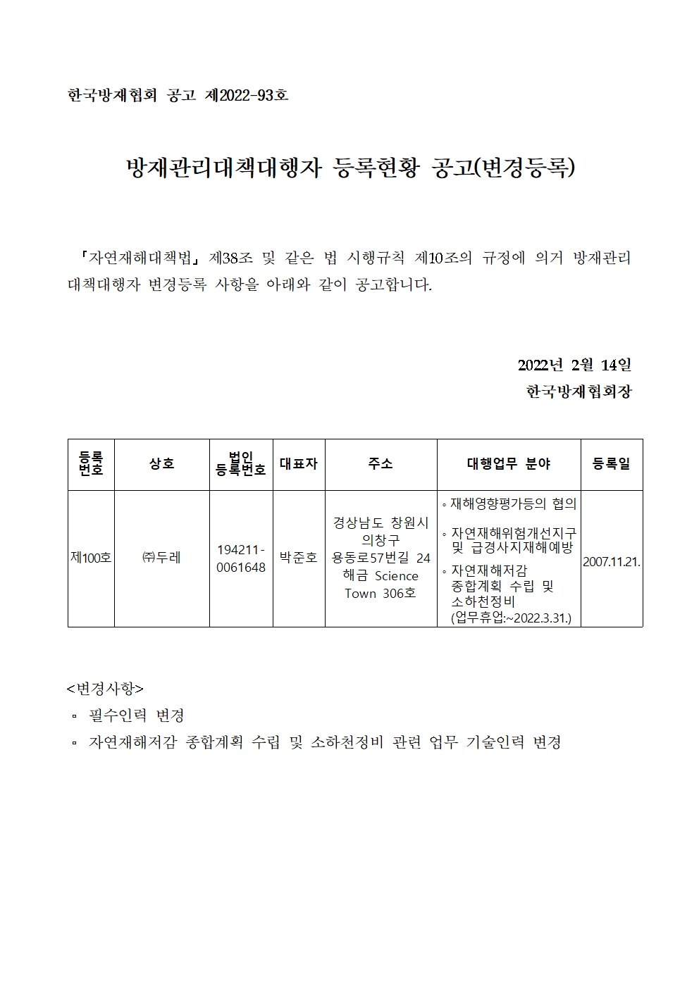 방재관리대책대행자 등록현황 공고(변경등록) - (주)두레 2022-02-14 공고문_제2022-93호_방재대행자 등록현황 공고(변경)_(주)두레.pdf (66718K) 목록보기 이전글방재관리대책대행자 등록현황 공고(업무재개) - (주)두레2022.02.14 다음글방재관리대책대행자 등록현황 공고(업무휴업) - (주)한경기술공사2022.02.14