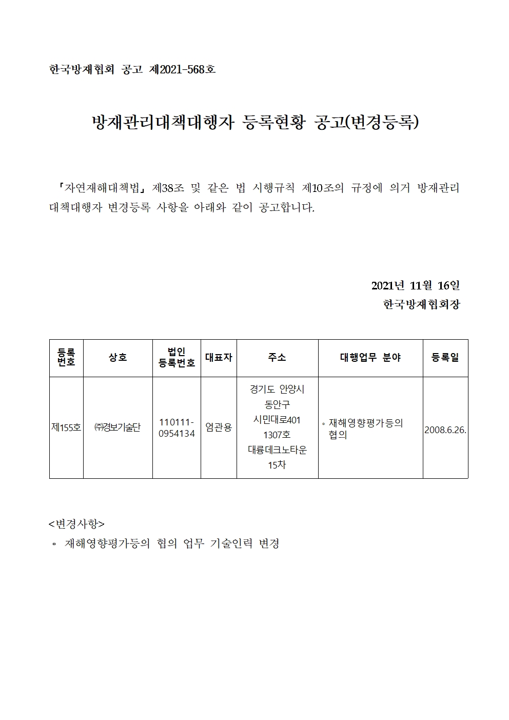 방재관리대책대행자 등록현황 공고(변경등록) - (주)경보기술단 2021-11-16 공고문_제2021-568호_방재대행자 등록현황 공고(변경)_(주)경보기술단.pdf (58603K) 목록보기 이전글방재관리대책대행자 등록현황 공고(변경등록) - (주)동서엔지니어링종합건축사사무소2021.11.16 다음글방재관리대책대행자 등록현황 공고(변경등록) - (주)평화엔지니어링2021.11.16