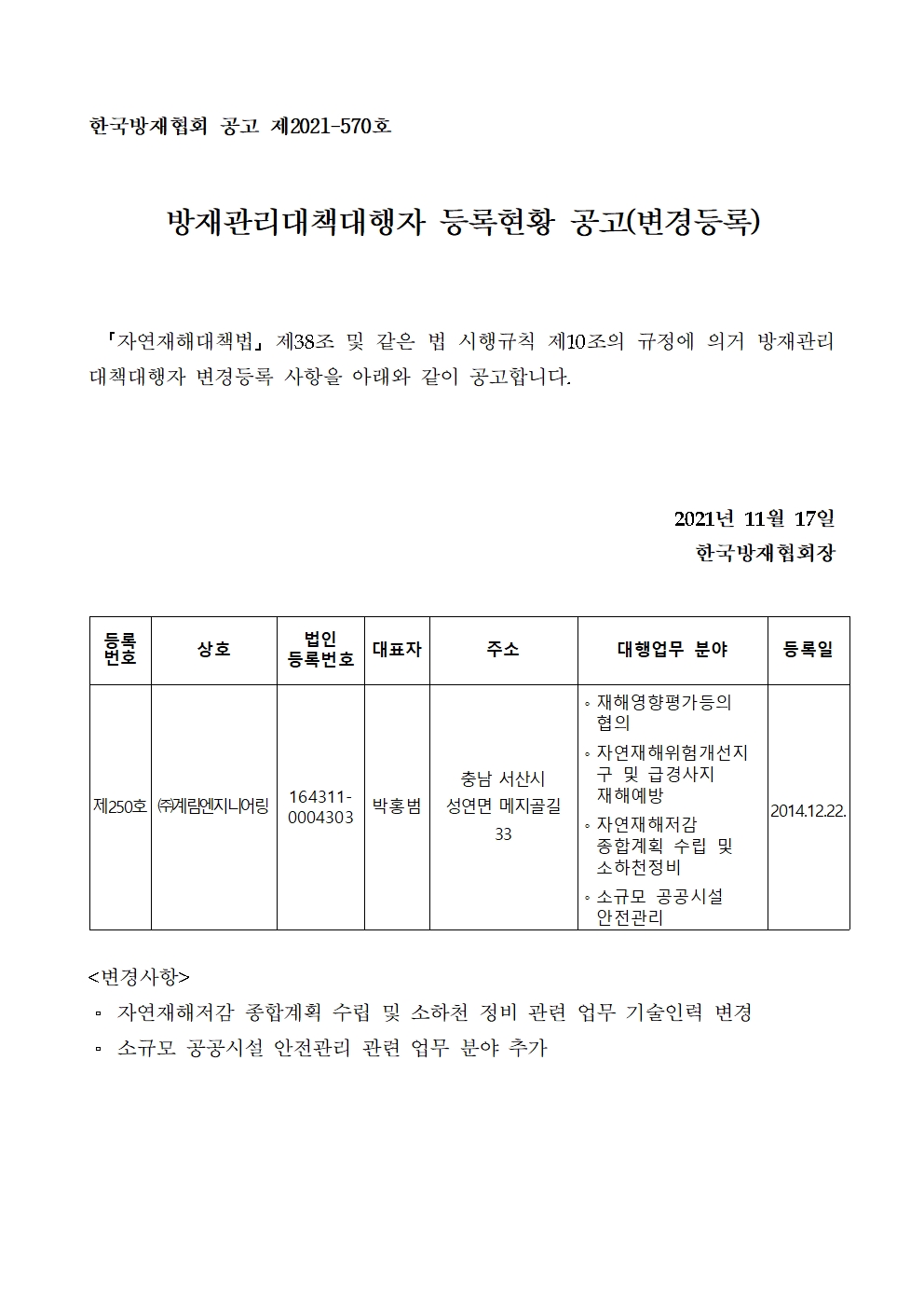 방재관리대책대행자 등록현황 공고(변경등록) - (주)계림엔지니어링 2021-11-17 공고문_제2021-570호_방재대행자 등록현황 공고(변경)_(주)계림엔지니어링.pdf (67305K) 목록보기 이전글방재관리대책대행자 등록현황 공고(변경등록) - (주)한국종합엔지니어링2021.11.17 다음글방재관리대책대행자 등록현황 공고(변경등록) - (주)동서엔지니어링종합건축사사무소2021.11.16