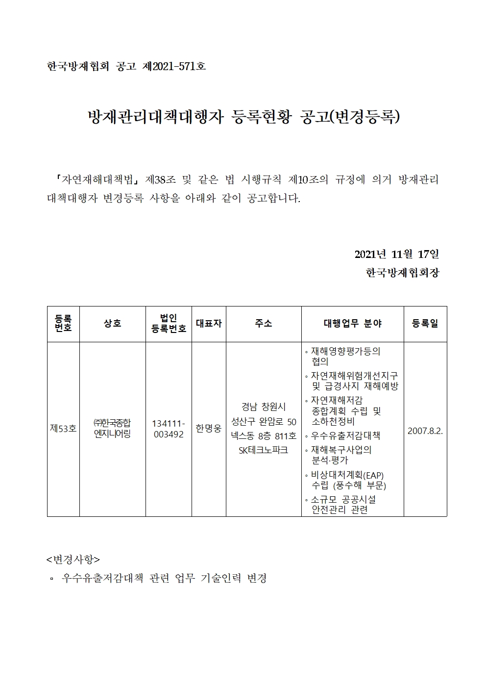방재관리대책대행자 등록현황 공고(변경등록) - (주)한국종합엔지니어링 2021-11-17 공고문_제2021-571호_방재대행자 등록현황 공고(변경)_(주)한국종합엔지니어링.pdf (70790K) 목록보기 이전글방재관리대책대행자 등록현황 공고(변경등록) - (주)세종방재연구소2021.11.17 다음글방재관리대책대행자 등록현황 공고(변경등록) - (주)계림엔지니어링2021.11.17