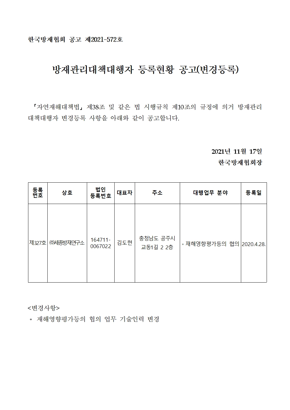 방재관리대책대행자 등록현황 공고(변경등록) - (주)세종방재연구소 2021-11-17 공고문_제2021-572호_방재대행자 등록현황 공고(변경)_(주)세종방재연구소-01.pdf (57475K) 목록보기 이전글방재관리대책대행자 등록현황 공고(변경등록) - (주)강동건설엔지니어링2021.11.17 다음글방재관리대책대행자 등록현황 공고(변경등록) - (주)한국종합엔지니어링2021.11.17