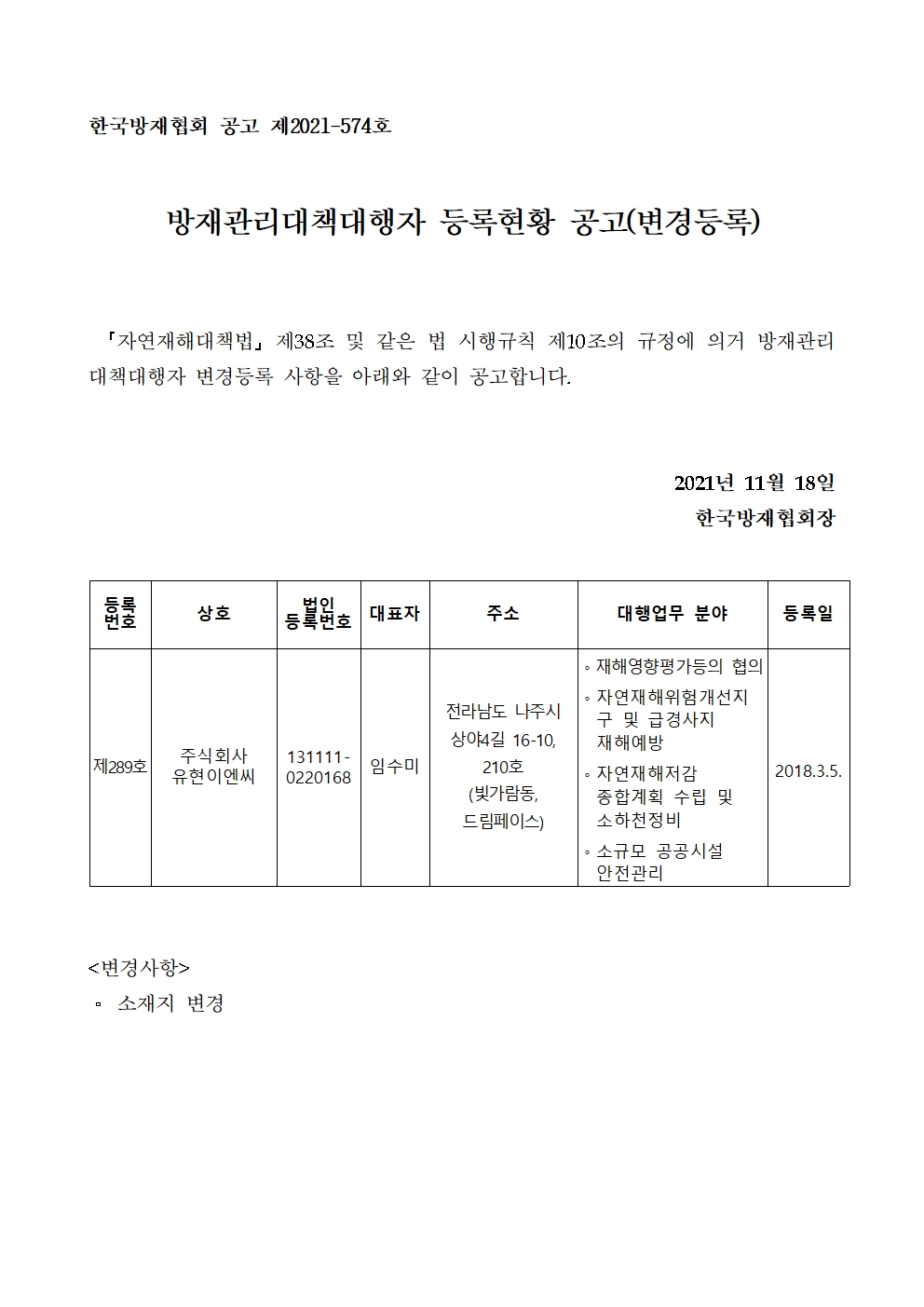방재관리대책대행자 등록현황 공고(변경등록) - 주식회사 유현이엔씨 2021-11-18 공고문_제2021-574호_방재대행자 등록현황 공고(변경)_주식회사 유현이엔씨.pdf (64271K) 목록보기 이전글방재관리대책대행자 등록현황 공고(변경등록) - (주)대영엔지니어링2021.11.22 다음글방재관리대책대행자 등록현황 공고(변경등록) - (주)강동건설엔지니어링2021.11.17