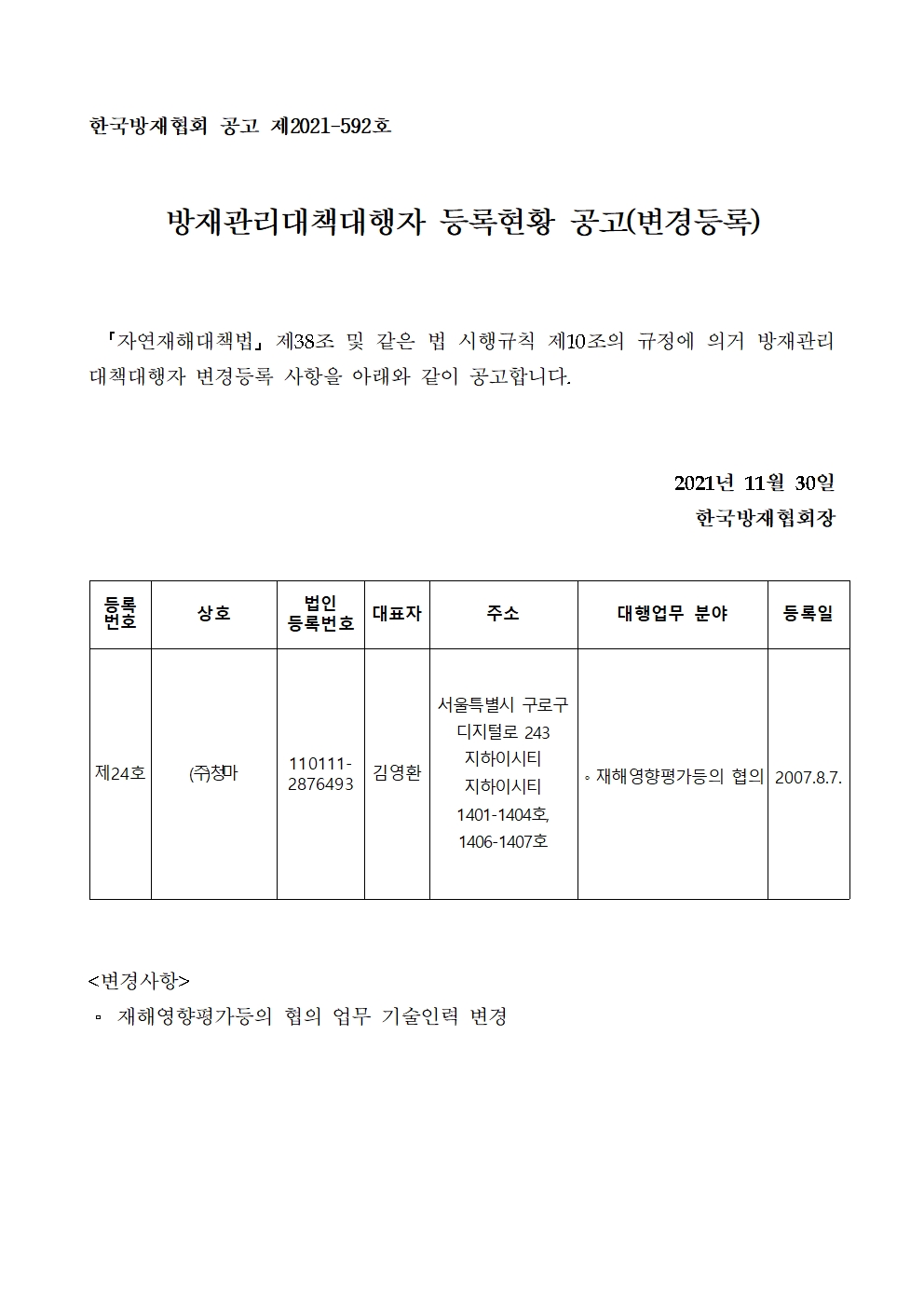 방재관리대책대행자 등록현황 공고(변경등록) - (주)청마 2021-11-30 공고문_제2021-592호_방재대행자 등록현황 공고(변경)_(주)청마.pdf (57231K) 목록보기 이전글방재관리대책대행자 등록현황 공고(업무재개) - (주)청마2021.11.30 다음글방재관리대책대행자 등록현황 공고(변경등록) - (주)범한엔지니어링종합건축사사무소2021.11.30