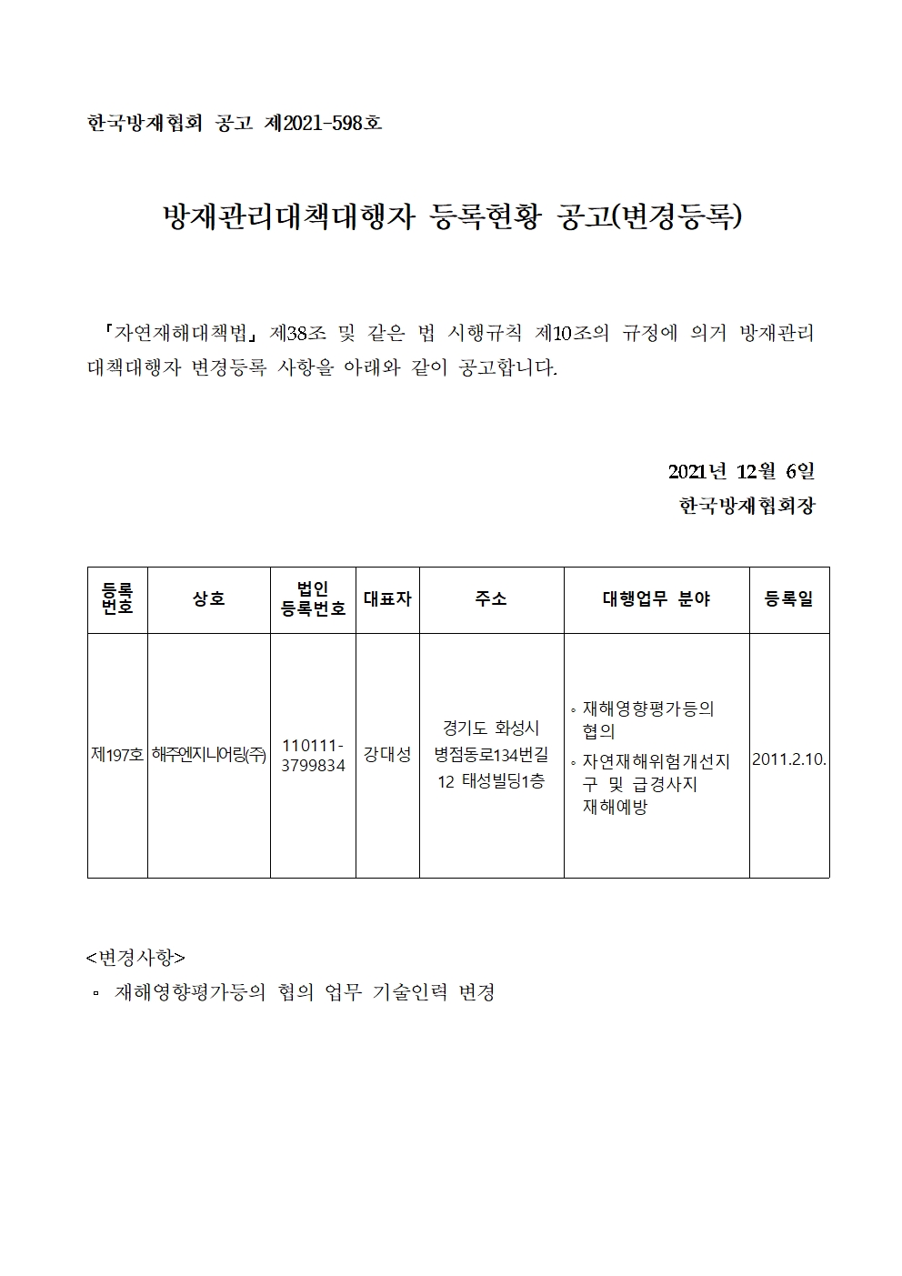 방재관리대책대행자 등록현황 공고(변경등록) - (주)해주엔지니어링 2021-12-06 공고문_제2021-598호_방재대행자 등록현황 공고(변경)_(주)해주엔지니어링.pdf (60967K) 목록보기 이전글방재관리대책대행자 등록현황 공고(변경등록) - 주식회사 한종2021.12.06 다음글방재관리대책대행자 등록현황 공고(변경등록) - (주)평화엔지니어링2021.12.06