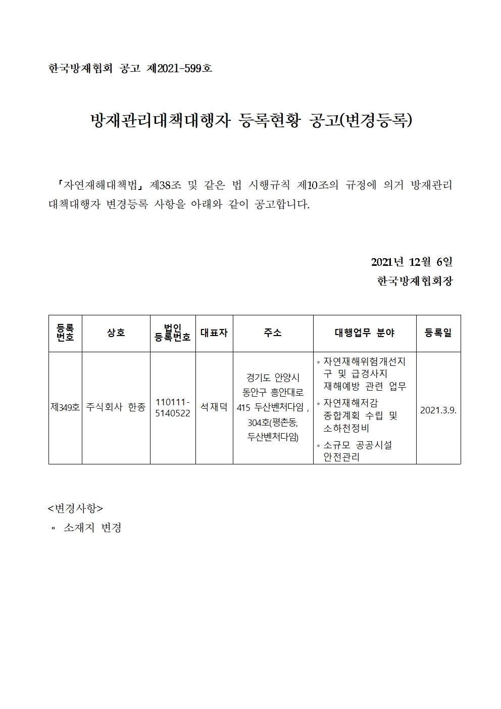 방재관리대책대행자 등록현황 공고(변경등록) - 주식회사 한종 2021-12-06 공고문_제2021-599호_방재대행자 등록현황 공고(변경)_주식회사 한종.pdf (62307K) 목록보기 이전글방재관리대책대행자 등록현황 공고(변경등록) - (주)녹색기술공사2021.12.06 다음글방재관리대책대행자 등록현황 공고(변경등록) - (주)해주엔지니어링2021.12.06