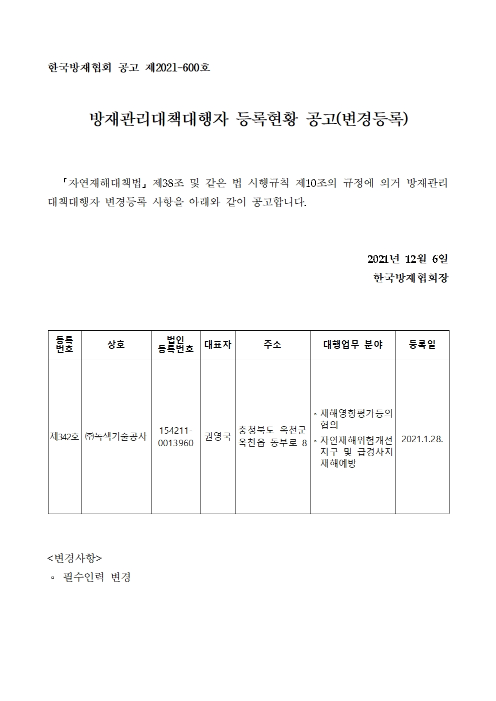 방재관리대책대행자 등록현황 공고(변경등록) - (주)녹색기술공사 2021-12-06 공고문_제2021-600호_방재대행자 등록현황 공고(변경)_(주)녹색기술공사.pdf (59204K) 목록보기 이전글방재관리대책대행자 등록현황 공고(업무휴업) - (주)녹색기술공사2021.12.06 다음글방재관리대책대행자 등록현황 공고(변경등록) - 주식회사 한종2021.12.06