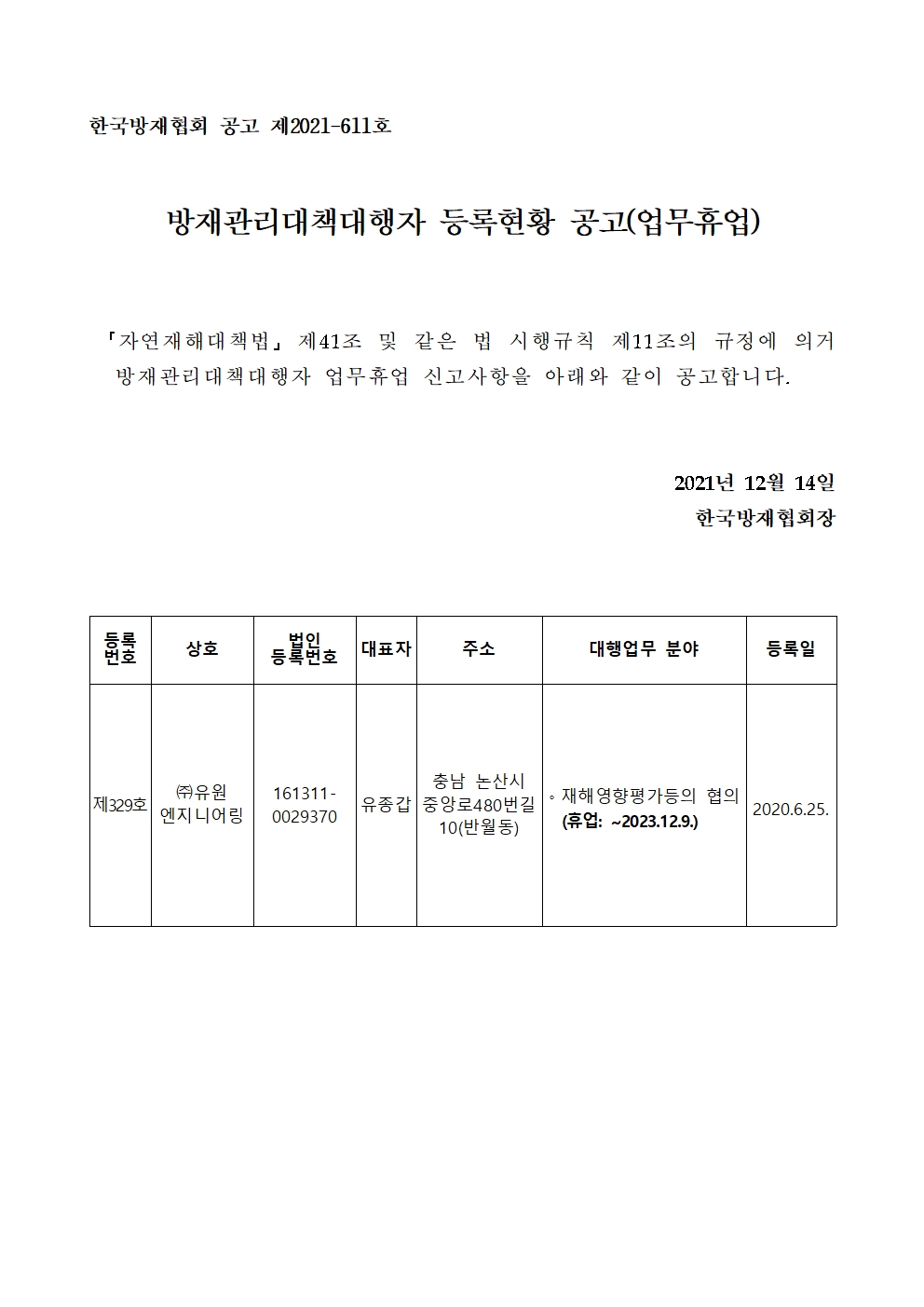 방재관리대책대행자 등록현황 공고(업무휴업) - (주)유원엔지니어링 2021-12-14 공고문_제2021-611호_방재대행자 등록현황 공고(휴업)_(주)유원엔지니어링.pdf (56829K) 목록보기 이전글방재관리대책대행자 등록현황 공고(변경등록) - (주)윤창2021.12.14 다음글방재관리대책대행자 등록현황 공고(변경등록) - (주)유원엔지니어링2021.12.14