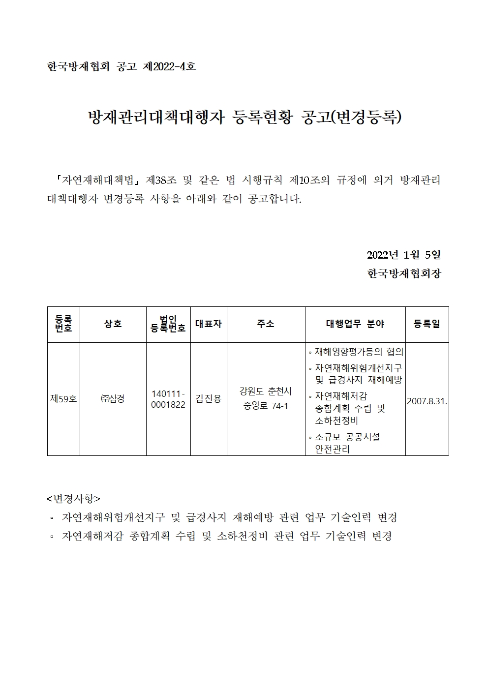 방재관리대책대행자 등록현황 공고(변경등록) - (주)삼경 2022-01-05 공고문_제2022-4호_방재대행자 등록현황 공고(변경)_(주)삼경.pdf (66406K) 목록보기 이전글방재관리대책대행자 등록현황 공고(업무휴업) - (주)두레2022.01.05 다음글방재관리대책대행자 등록현황 공고(변경등록) - (주)범한엔지니어링종합건축사사무소2022.01.05