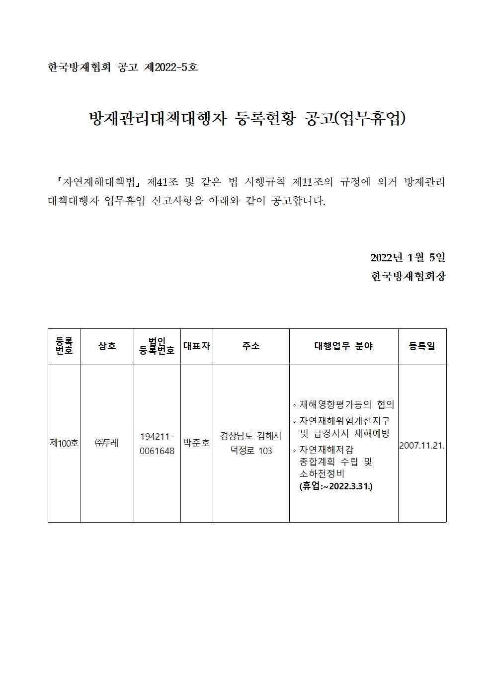 방재관리대책대행자 등록현황 공고(업무휴업) - (주)두레 2022-01-05 공고문_제2022-5호_방재대행자 등록현황 공고(휴업)_(주)두레.pdf (59414K) 목록보기 이전글방재관리대책대행자 등록현황 공고(변경등록) - (주)용마엔지니어링2022.01.12 다음글방재관리대책대행자 등록현황 공고(변경등록) - (주)삼경2022.01.05