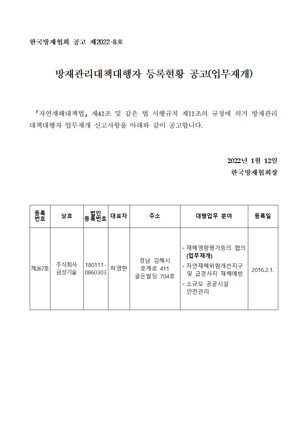 방재관리대책대행자 등록현황 공고(업무재개) - 주식회사 금성기술 2022-01-12 공고문_제2022-8호_방재대행자 등록현황 공고(재개)_(주)금성기술.pdf (58223K) 목록보기 이전글방재관리대책대행자 등록현황 공고(변경등록) - 주식회사 지비이엔지2022.01.12 다음글방재관리대책대행자 등록현황 공고(변경등록) - 주식회사 금성기술2022.01.12