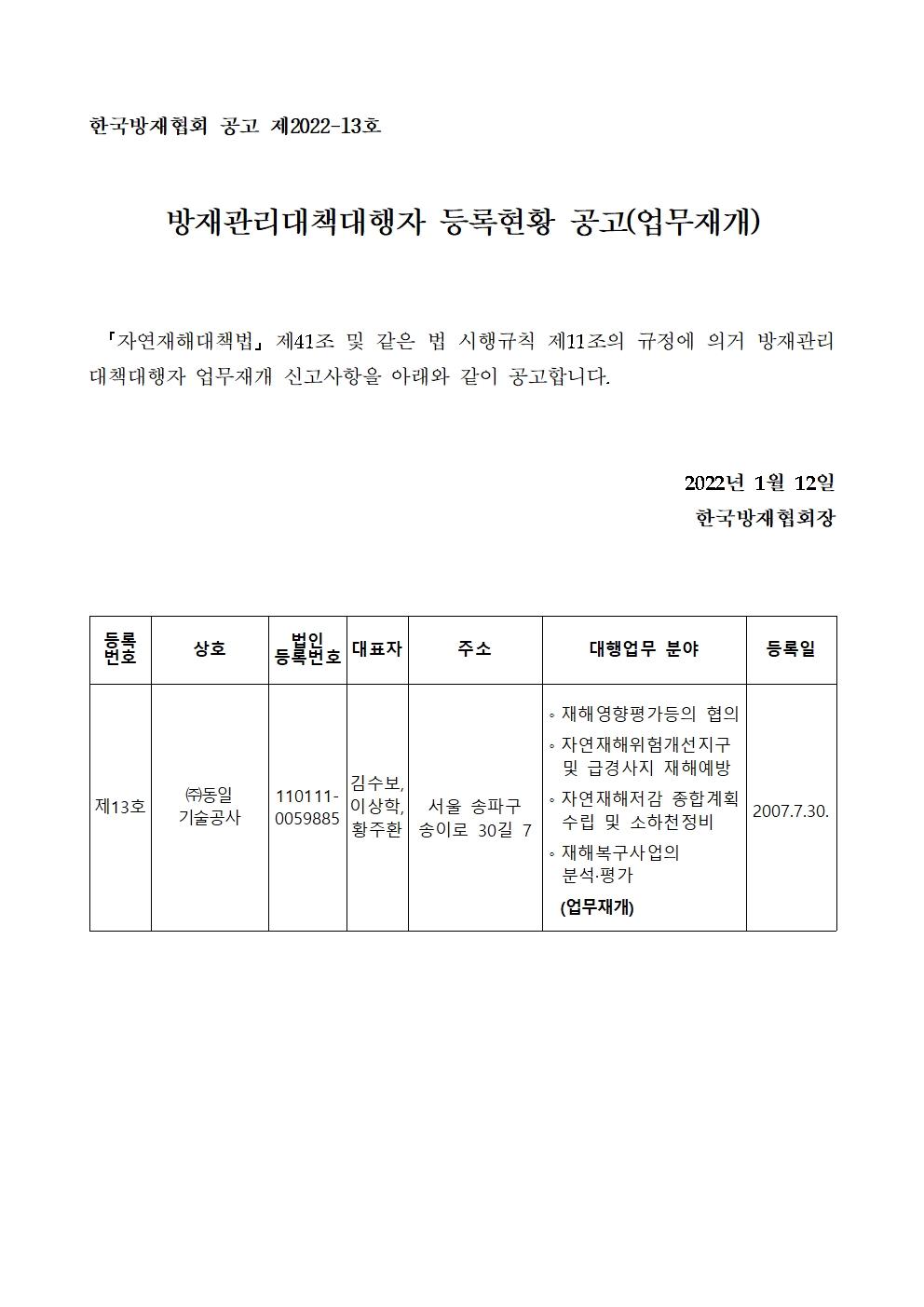 방재관리대책대행자 등록현황 공고(업무재개) - (주)동일기술공사 2022-01-12 공고문_제2022-13호_방재대행자 등록현황 공고(재개)_(주)동일기술공사.pdf (61445K) 목록보기 이전글방재관리대책대행자 등록현황 공고(업무폐업) - (주)내경엔지니어링2022.01.12 다음글방재관리대책대행자 등록현황 공고(변경등록) - (주)화신엔지니어링2022.01.12