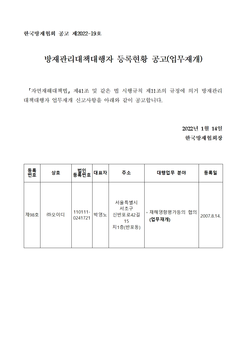 방재관리대책대행자 등록현황 공고(업무재개) - (주)오이디 2022-01-14 공고문_제2022-19호_방재대행자 등록현황 공고(재개)_(주)오이디.pdf (54317K) 목록보기 이전글방재관리대책대행자 등록현황 공고(변경등록) - (주)이도2022.01.14 다음글방재관리대책대행자 등록현황 공고(변경등록) - (주)오이디2022.01.14