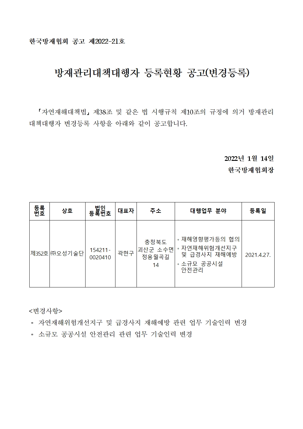 방재관리대책대행자 등록현황 공고(변경등록) - (주)오성기술단 2022-01-14 공고문_제2022-21호_방재대행자 등록현황 공고(변경)_(주)오성기술단.pdf (64444K) 목록보기 이전글방재관리대책대행자 등록현황 공고(업무재개) - (주)오성기술단2022.01.14 다음글방재관리대책대행자 등록현황 공고(변경등록) - (주)이도2022.01.14