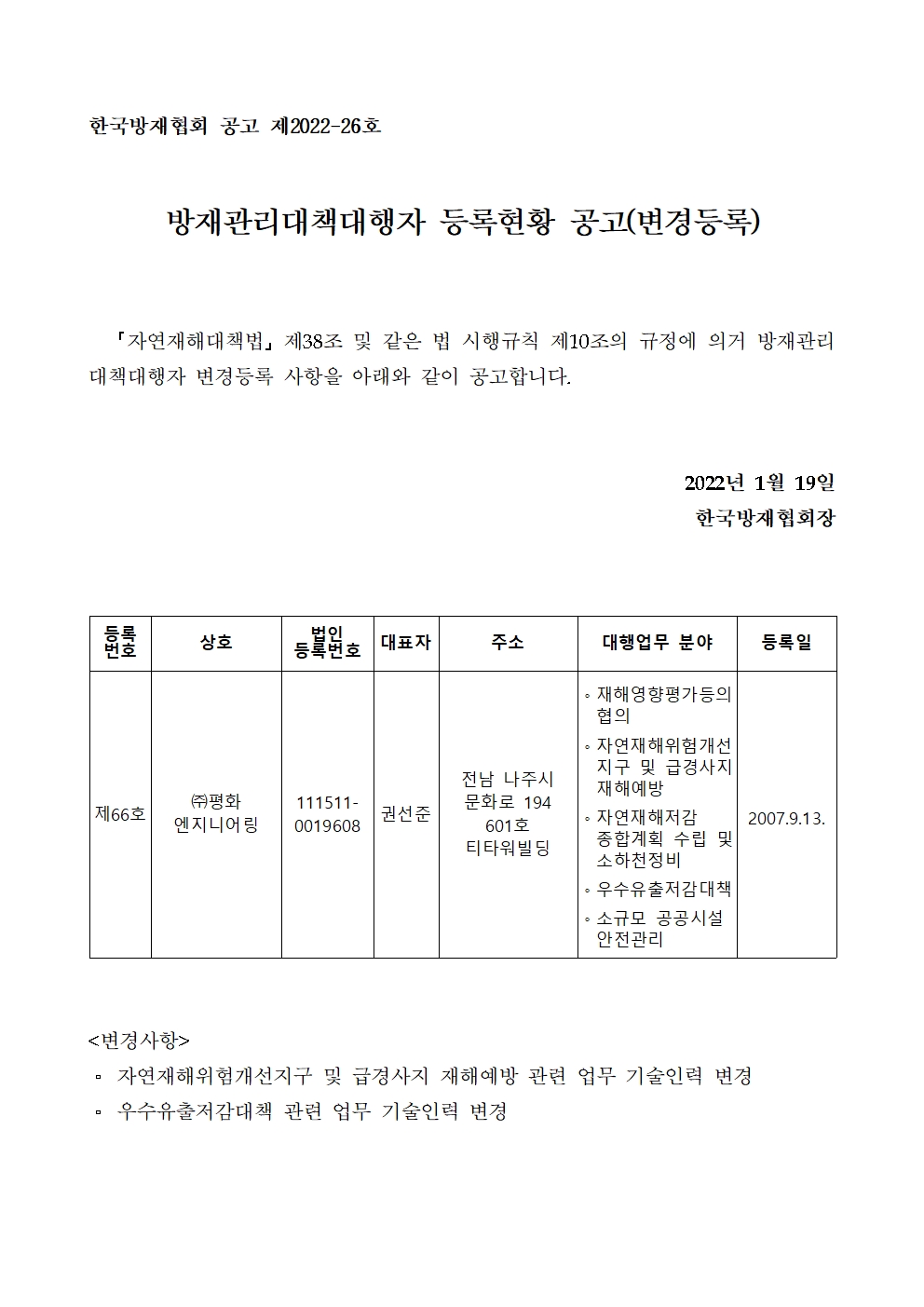 방재관리대책대행자 등록현황 공고(변경등록) - (주)평화엔지니어링 2022-01-19 공고문_제2022_26호_방재대행자 등록현황 공고(변경)_(주)평화엔지니어링.pdf (67608K) 목록보기 이전글방재관리대책대행자 등록현황 공고(변경등록) - (주)선엔지니어링종합건축사사무소2022.01.19 다음글방재관리대책대행자 등록현황 공고(변경등록) - (주)우리이엔지건축사사무소2022.01.19