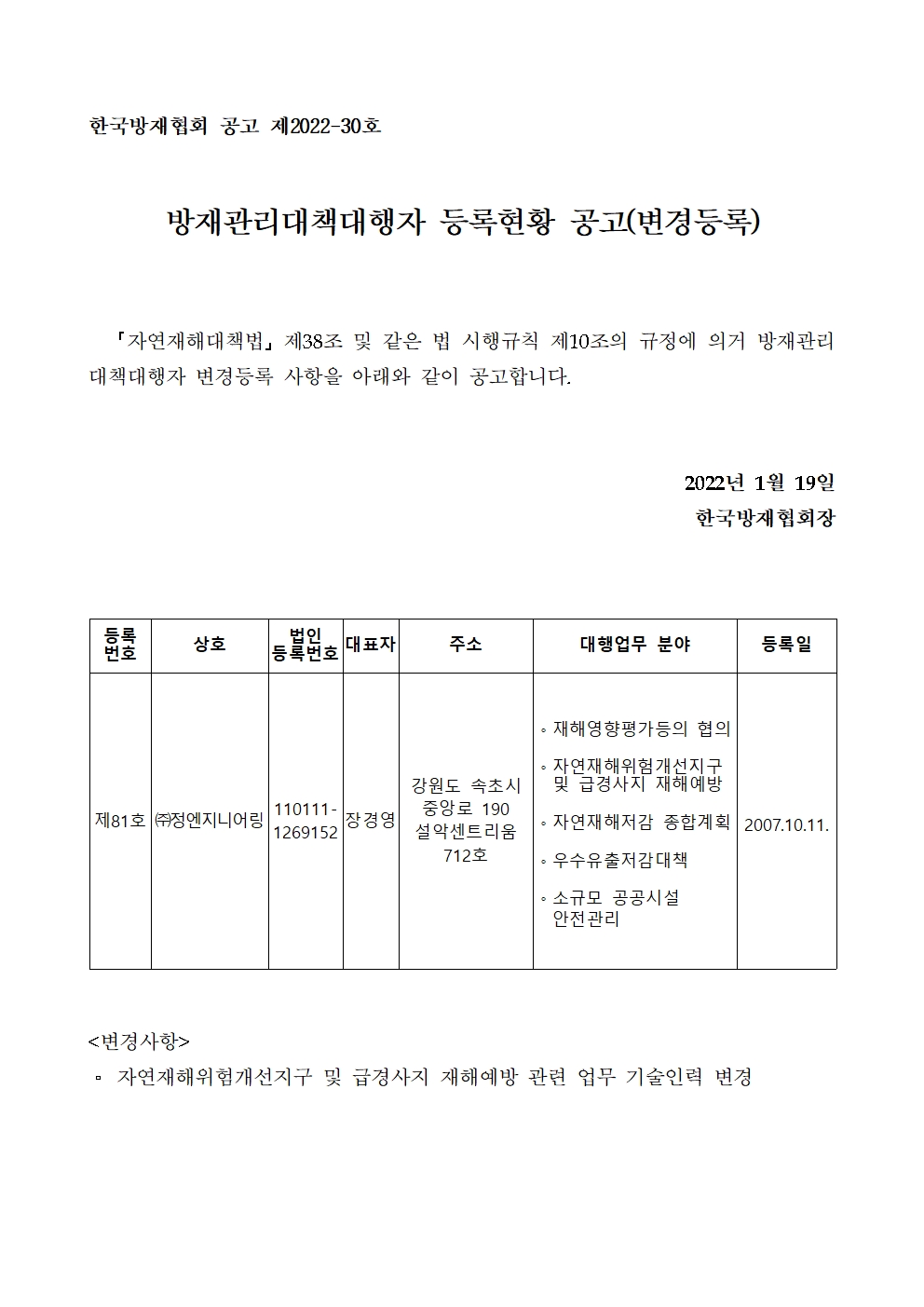 방재관리대책대행자 등록현황 공고(변경등록) - (주)정엔지니어링 2022-01-19 공고문_제2022-30호_방재대행자 등록현황 공고(변경)_(주)정엔지니어링.pdf (65747K) 목록보기 이전글방재관리대책대행자 등록현황 공고(변경등록) - (주)범산2022.01.19 다음글방재관리대책대행자 등록현황 공고(변경등록) - (주)바우컨설탄트2022.01.19
