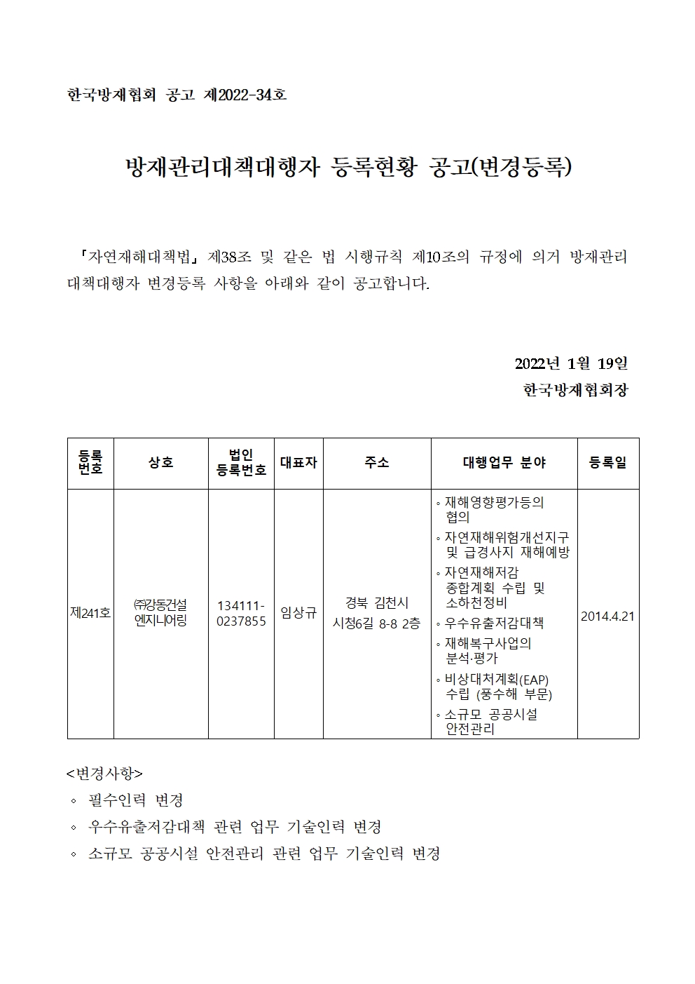 방재관리대책대행자 등록현황 공고(변경등록) - (주)강동건설엔지니어링 2022-01-19 공고문_제2022-34호_방재대행자 등록현황 공고(변경)_(주)강동건설엔지니어링.pdf (69460K) 목록보기 이전글방재관리대책대행자 등록현황 공고(변경등록) - (주)고려엔지니어링2022.01.19 다음글방재관리대책대행자 등록현황 공고(변경등록) - 주식회사 대성기술2022.01.19