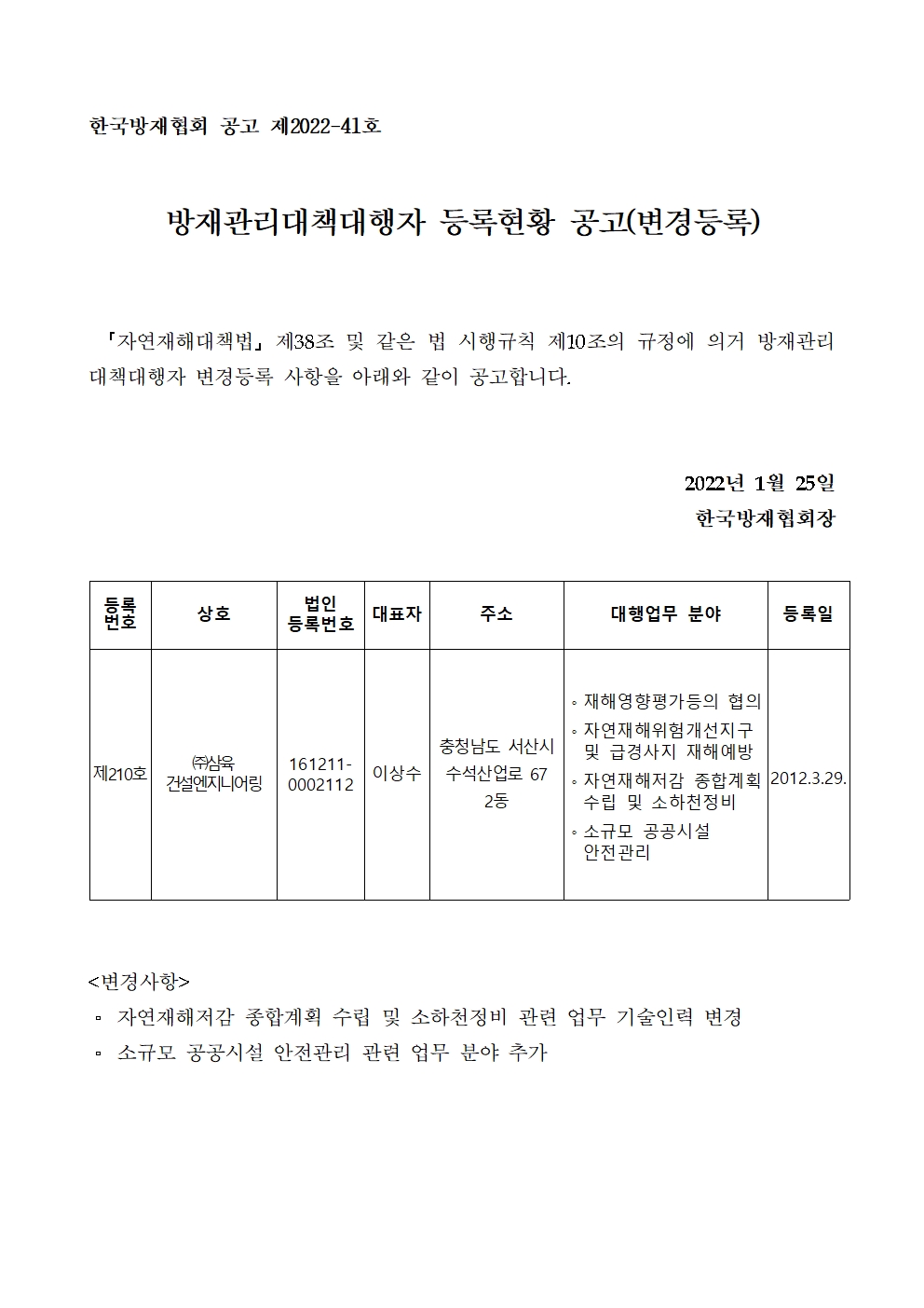 방재관리대책대행자 등록현황 공고(변경등록) - (주)삼육건설엔지니어링 2022-01-25 공고문_제2022-41호_방재대행자 등록현황 공고(변경)_(주)삼육건설엔지니어링.pdf (67791K) 목록보기 이전글방재관리대책대행자 등록현황 공고(업무폐업) - (주)삼육건설엔지니어링2022.01.25 다음글방재관리대책대행자 등록현황 공고(신규등록) - (주)지케이엔지니어링2022.01.25