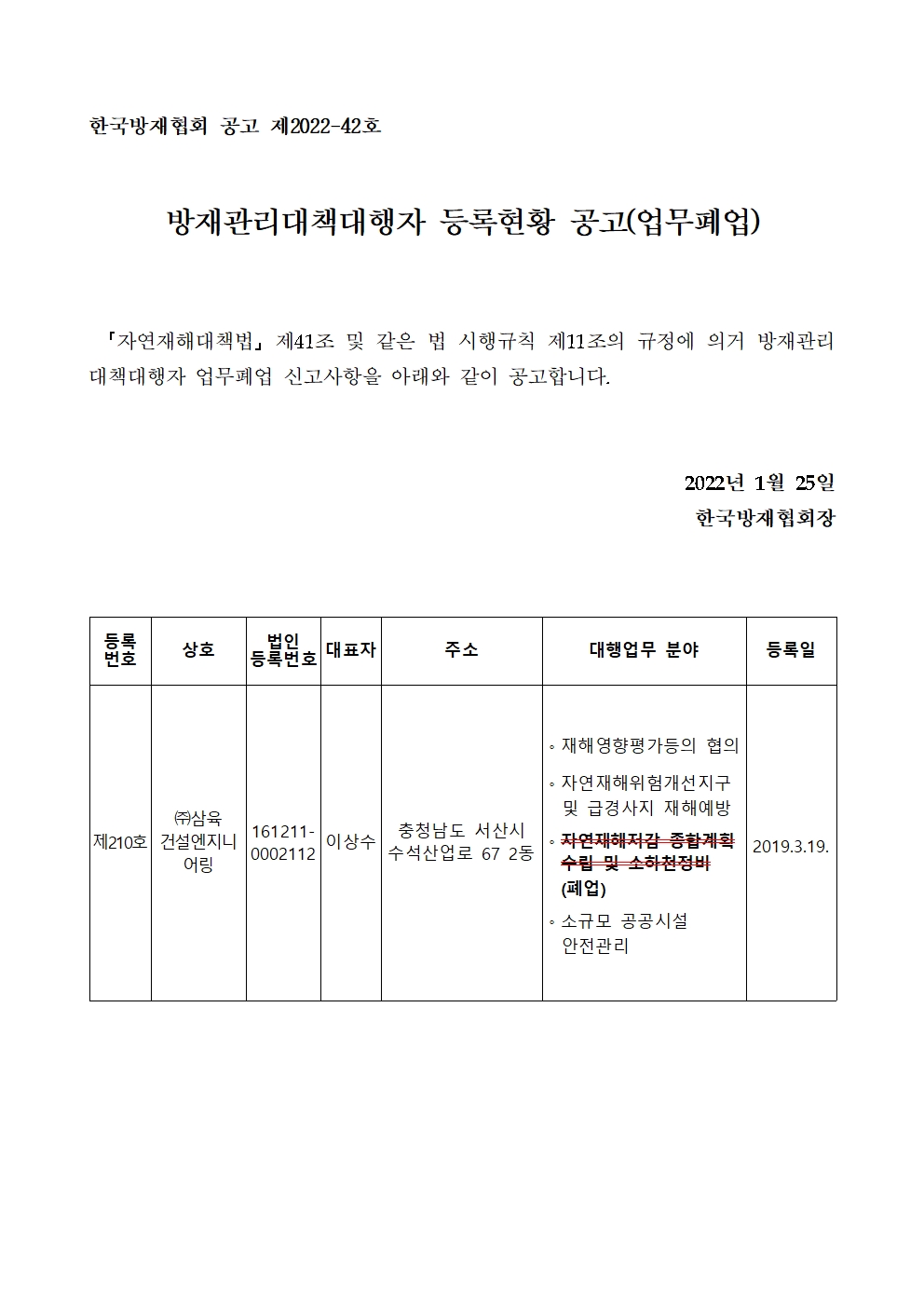 방재관리대책대행자 등록현황 공고(업무폐업) - (주)삼육건설엔지니어링 2022-01-25 공고문_제2022-42호_방재대행자 등록현황 공고(폐업)_(주)삼육건설엔지니어링.pdf (63994K) 목록보기 이전글방재관리대책대행자 등록현황 공고(변경등록) - (주)성지토목기술공사2022.01.25 다음글방재관리대책대행자 등록현황 공고(변경등록) - (주)삼육건설엔지니어링2022.01.25