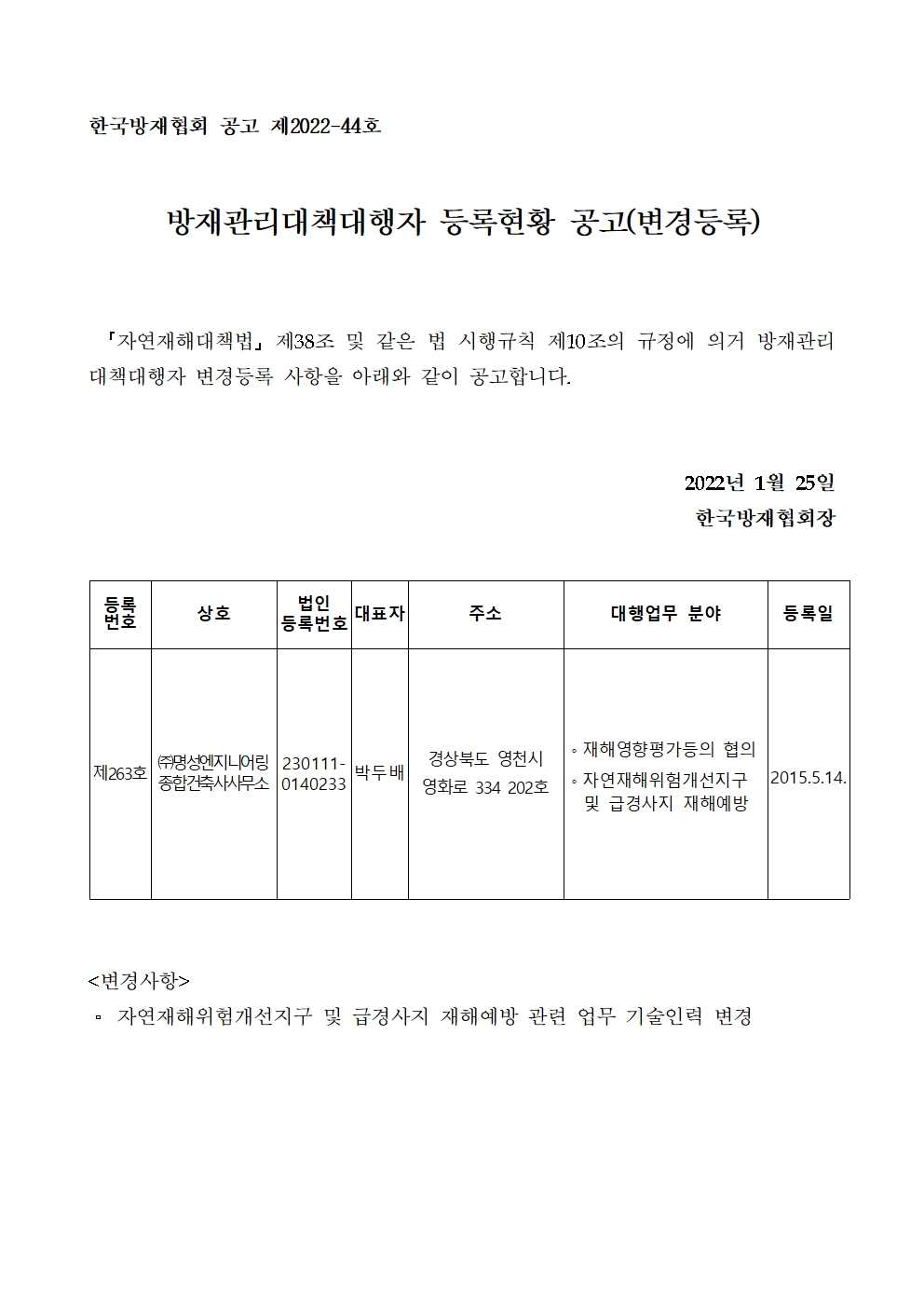 방재관리대책대행자 등록현황 공고(변경등록) - (주)명성엔지니어링종합건축사사무소 2022-01-25 공고문_제2022-44호_방재대행자 등록현황 공고(변경)_(주)명성엔지니어링종합건축사사무소.pdf (61326K) 목록보기 이전글방재관리대책대행자 등록현황 공고(변경등록) - (주)건화2022.01.25 다음글방재관리대책대행자 등록현황 공고(변경등록) - (주)성지토목기술공사2022.01.25