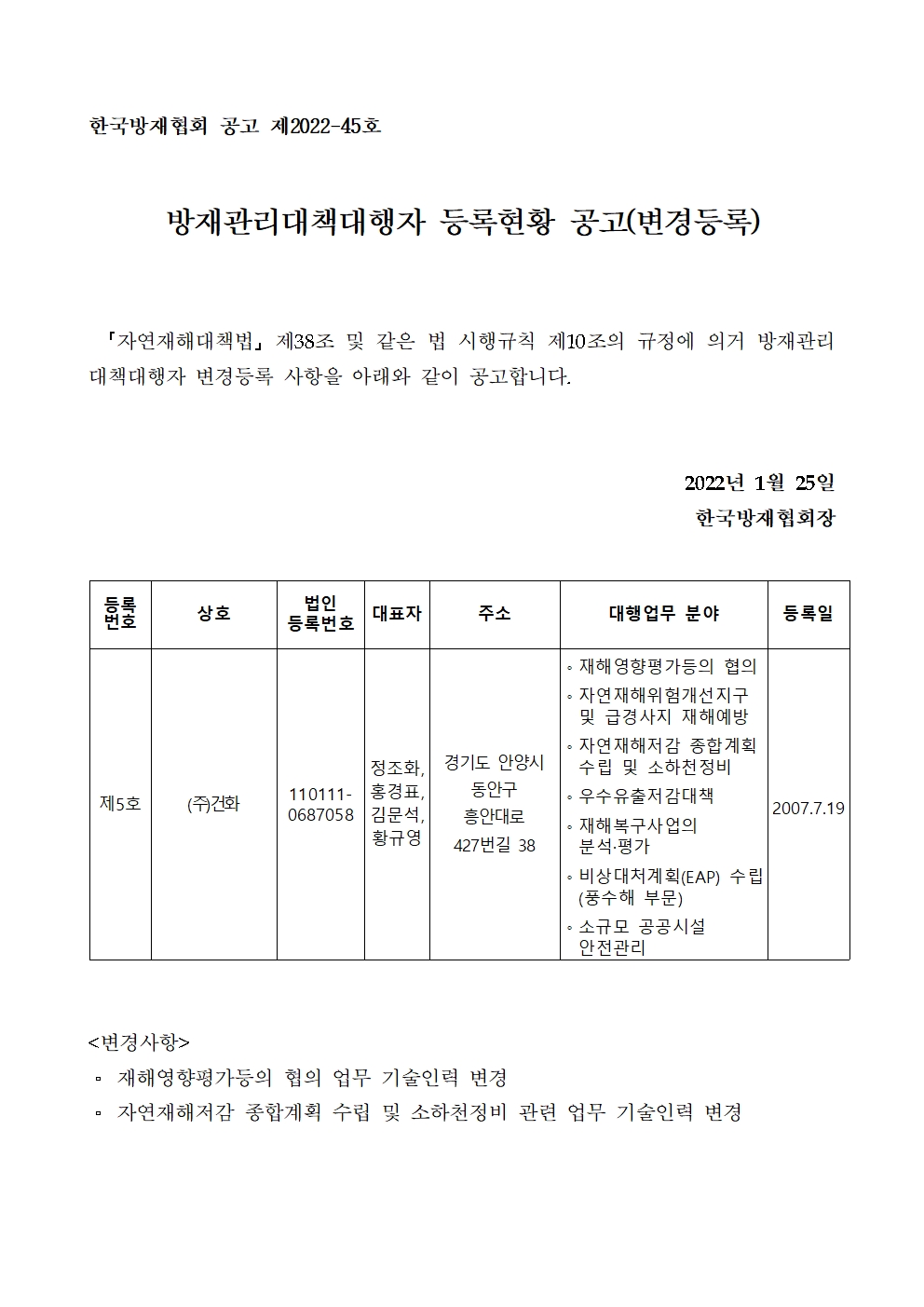 방재관리대책대행자 등록현황 공고(변경등록) - (주)건화 2022-01-25 공고문_제2022-45호_방재대행자 등록현황 공고(변경)_(주)건화.pdf (70725K) 목록보기 이전글방재관리대책대행자 등록현황 공고(변경등록) - (주)건일2022.01.25 다음글방재관리대책대행자 등록현황 공고(변경등록) - (주)명성엔지니어링종합건축사사무소2022.01.25