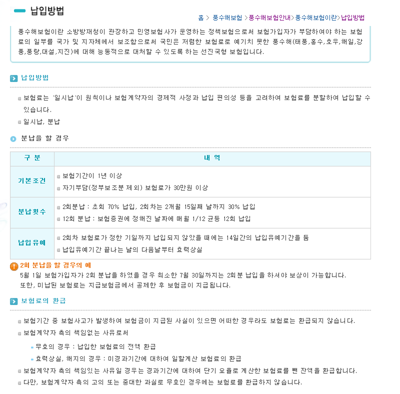 풍수해보험 알아보기 - (5) 납입방법 2014-07-15 목록보기 이전글풍수해보험 알아보기 - (6) 가입절차안내2014.07.16 다음글풍수해보험 알아보기 - (4) 주요내용2014.07.14