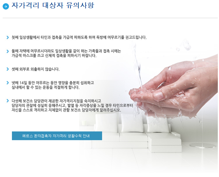 메르스-자가격리 대상자 유의사항 2015-06-11 메르스 환자접촉자 자가격리 생활수칙 안내.pdf (1392490K) 목록보기 이전글메르스-여행자 주의사항2015.06.11 다음글메르스-일반인 유의사항2015.06.11