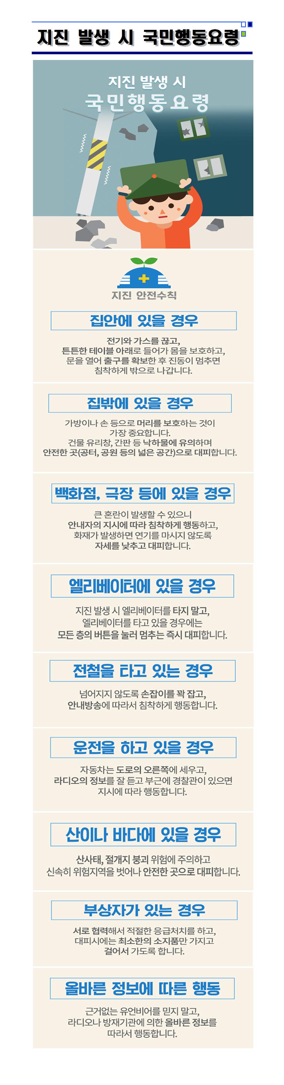 지진 발생 시 국민행동요령 2016-09-22 목록보기 이전글제언 - '이봉창 의사를 상기해 주세요.'2016.10.10 다음글제언 - 임진강 상류 북한의 "황강댐"을 제대로 알자2016.09.06