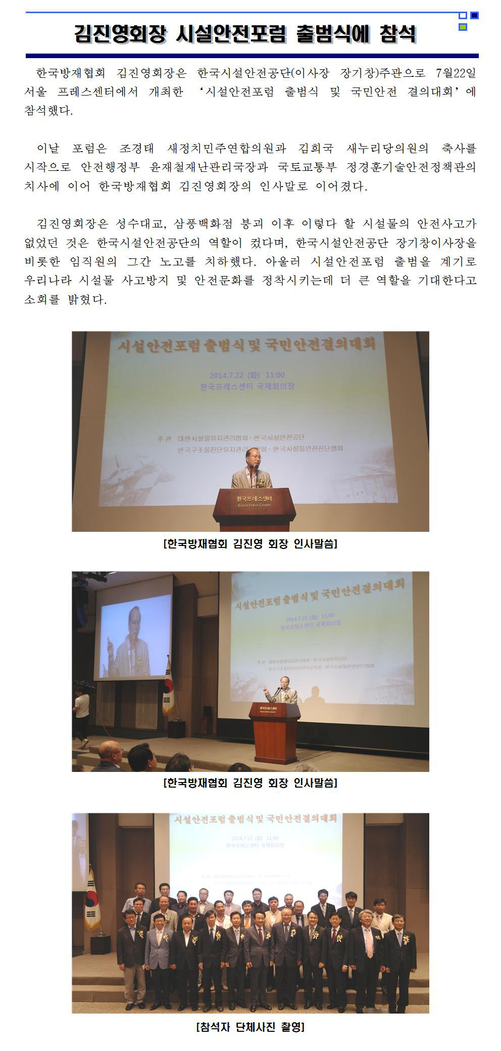 김진영회장 시설안전포럼 출범식에 참석 2014-07-22 목록보기 이전글한국방재협회 고문자문위원 간담회 개최2014.07.28 다음글한국방재협회 전문위원회 간담회 개최2014.07.22