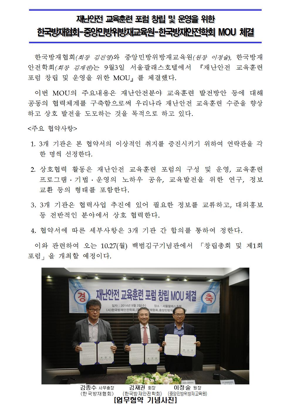 한국방재협회-중앙민방위방재교육원-한국방재안전학회 MOU 체결 2014-09-04 목록보기 이전글방재신기술 종합평가 실시 - (주)데코페이브2014.09.05 다음글[축결혼] 우리협회 강병화 고문님 자녀 결혼식 알림2014.09.04