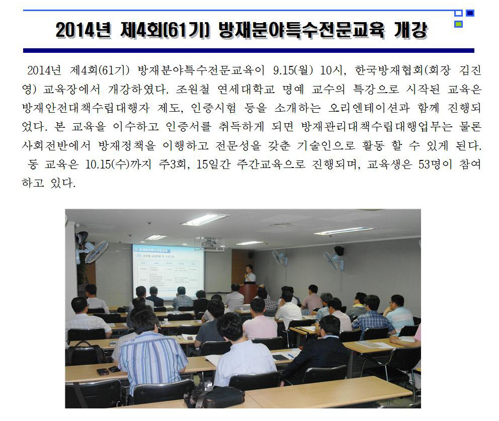 2014년 제4회(61기) 방재분야특수전문교육 개강식 2014-09-16 목록보기 이전글한국방재협회 제61회 이사회 개최2014.09.17 다음글김진영 회장 'LH 재난방재 자문위원회 위촉식'에 참석2014.09.11