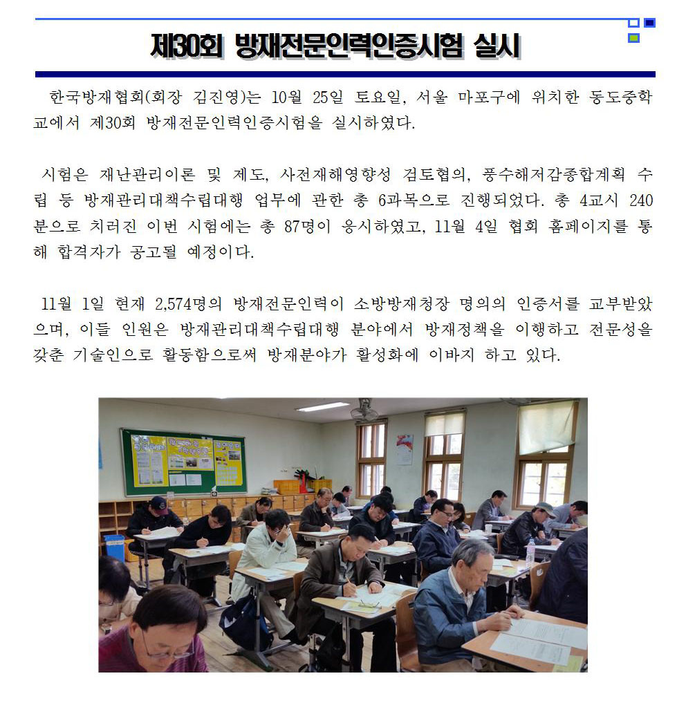제30회 방재전문인력인증시험 실시 2014-10-31 목록보기 이전글"2014 한국방재협회 특별회원 워크숍" 개최2014.10.31 다음글김진영 회장, "5R운동 실천을 위한 여성의 역할 심포지엄" 에서 강연2014.10.22