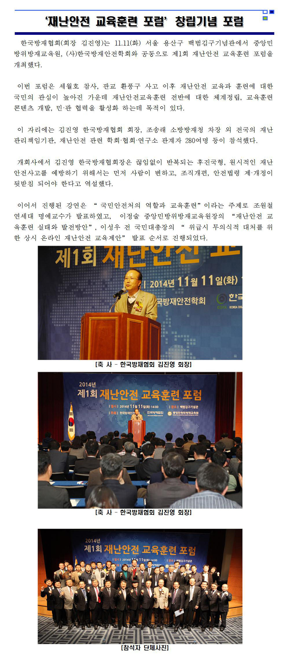 '재난안전 교육훈련 포럼' 창립기념 포럼 2014-11-12 목록보기 이전글[축결혼] 평생회원 삼보엔지니어링 김혜양 팀장 자녀 결혼식 알림2014.11.12 다음글[축결혼] 평생회원 (주)경호엔지니어링 조윤행 부사장 자녀 결혼식 알림]2014.11.05