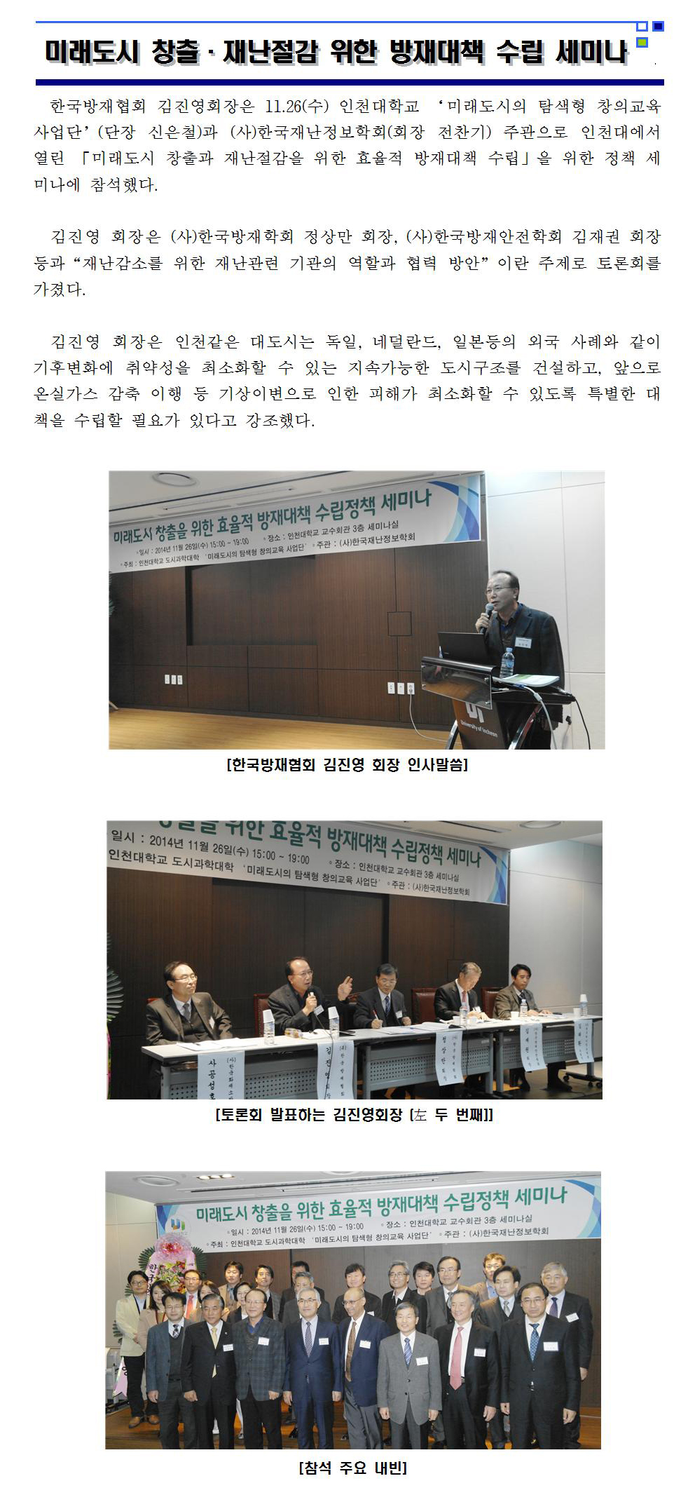 미래도시 창출. 재난절감 위한 방재대책 수립 세미나 2014-12-08 목록보기 이전글재해대책유공 포상 전수식2014.12.09 다음글한국방재협회, 재해대책 유공 단체표창 수상2014.11.26