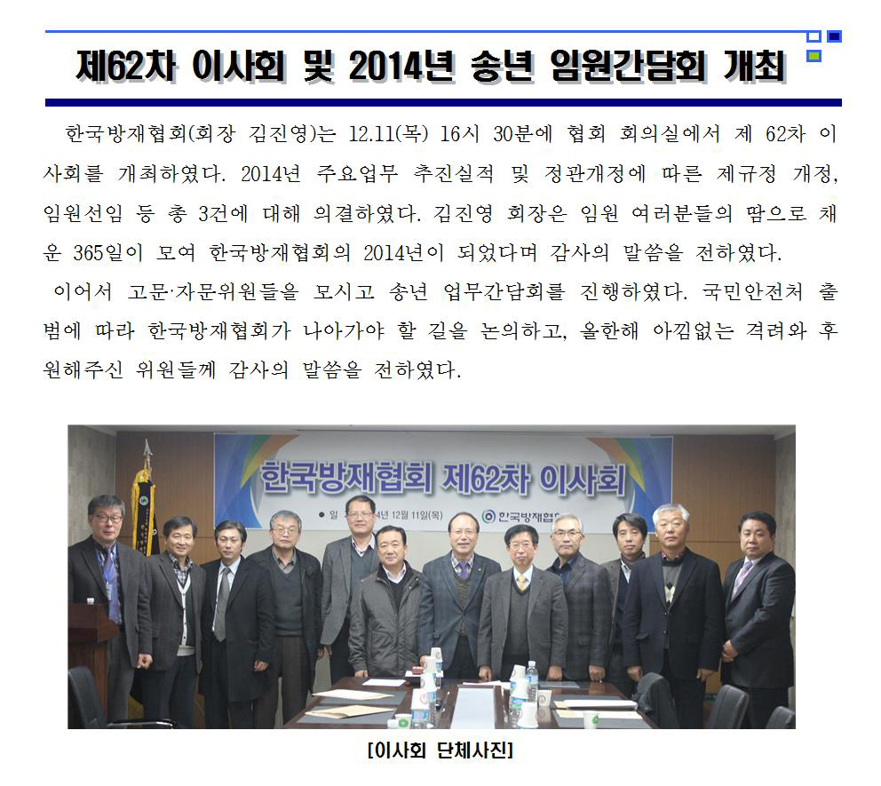 제62차 이사회 및 2014년 송년 임원간담회 개최 2014-12-12 목록보기 이전글2014 재해대책 지역자율 방재활동 공로자 표창2014.12.15 다음글[부고] 평생회원 (주)유신 이명훈 전무 동생상 알림2014.12.10