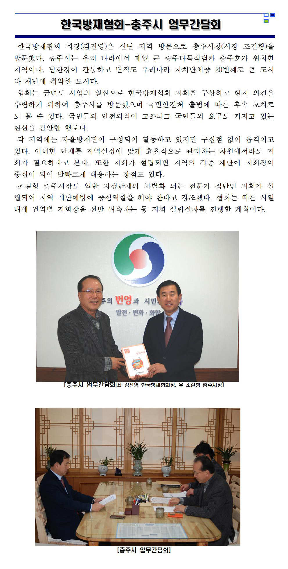 한국방재협회-충주시 업무간담회 2015-01-14 목록보기 이전글[부고] 개인회원 (주)유신 신재성 차장 장인상 알림2015.01.19 다음글국민안전처 예방정책관 업무보고회2015.01.12